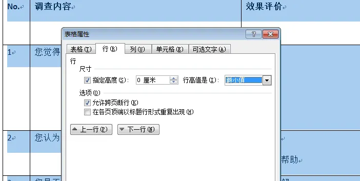 在显示的“表格属性”里,点击“行”,然后在“指定高度”里,把“行高值是”后面的参数改为“最小值”,再点“确定”,此时你就可以发现这个表格里所有行里的内容,都完整地显示出来了。