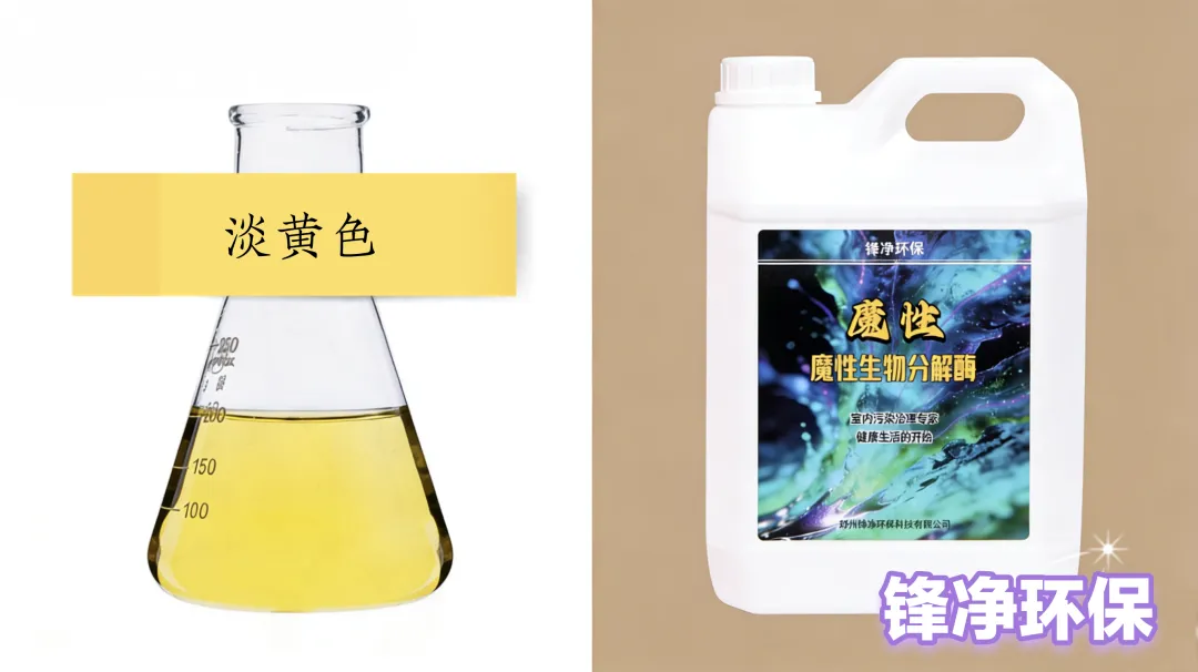 魔性生物分解酶采用高活性植物除醛提取液、稳定剂、促进剂、聚合剂、去离子水等原料精制而成。高活性植物除醛提取液在气态、液态、固态下均能够与甲醛、TVOC等有害物质发生反应,持续作用,效果持久。