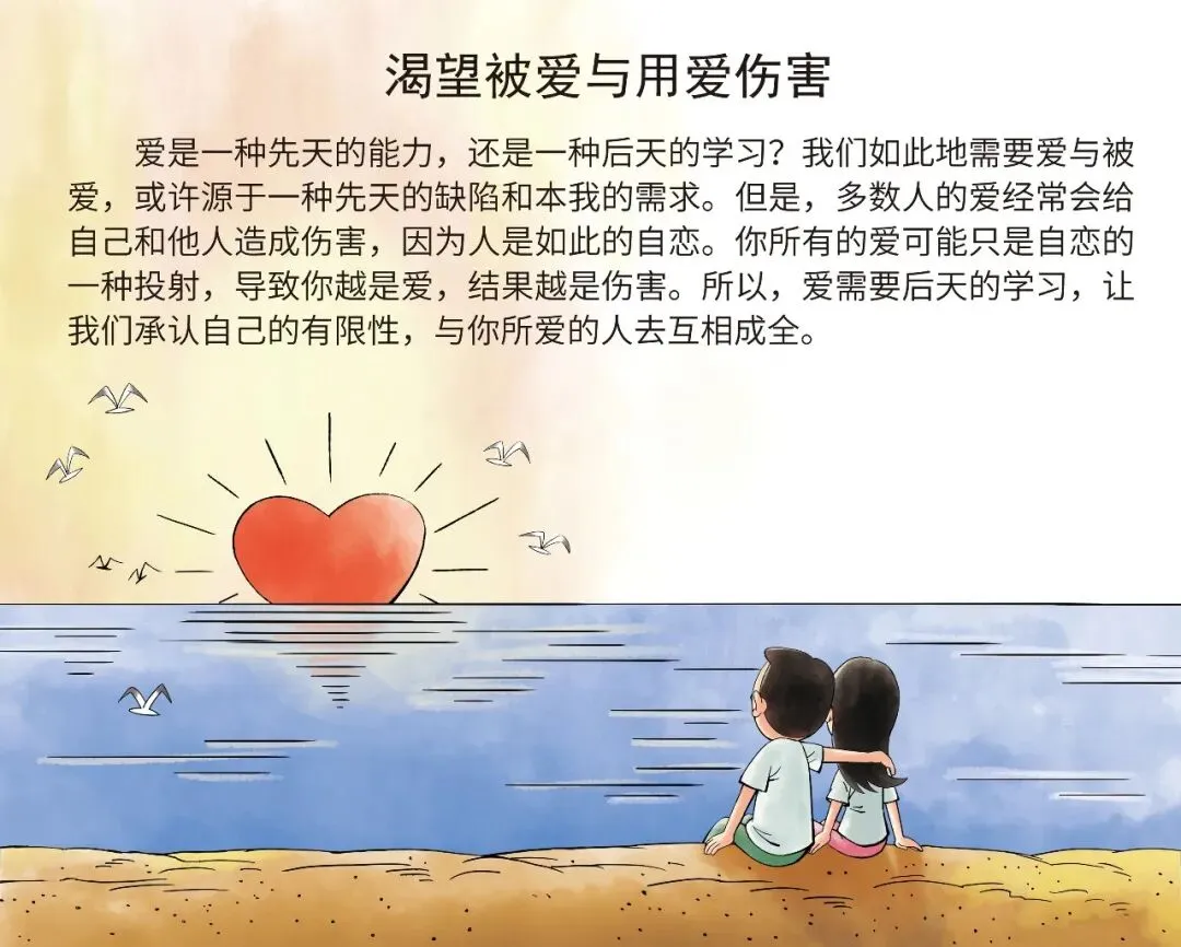 但是,多数人的爱经常会给自己和他人造成伤害,因为人是如此的自恋。你所有的爱可能只是自恋的一种投射,导致你越是爱,结果越是伤害。所以,爱需要后天的学习,让我们承认自己的有限性,与你所爱的人去互相成全。