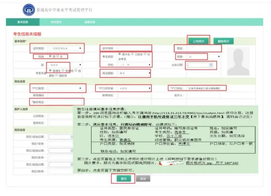 各位家长您好,为了后期学业水平考试报名工作需要,请您于本周末(3月28日到3月29日)完成学业水平系统学生基本信息的填写工作(如有特殊情况没有填写完成,请告知班主任,后期填写等学校通知)。请用360浏览器或者谷歌浏览器打开访问地址http://111.31.213.76:9302/tjxc/student.html。