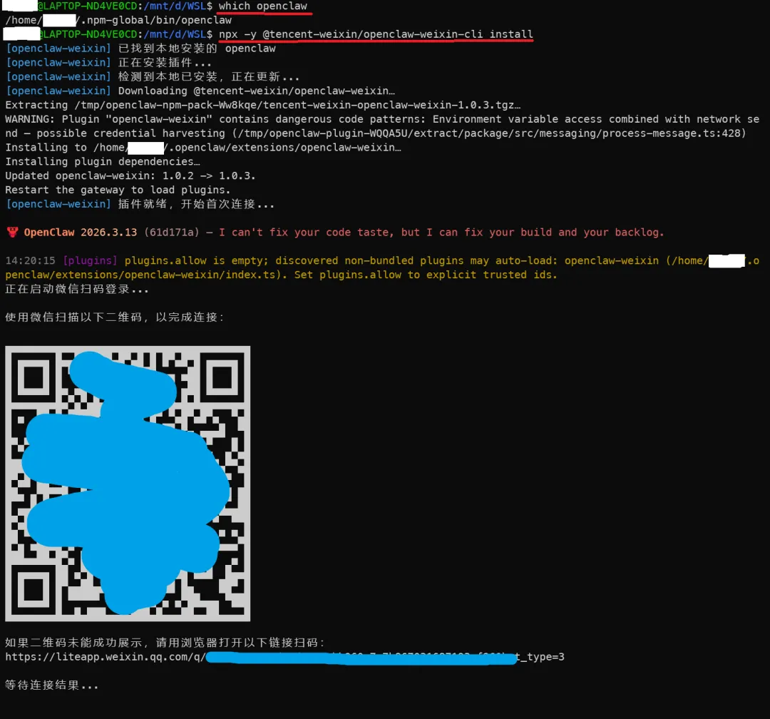 安装完成后,终端会自动弹出微信登录二维码,用手机微信扫码确认授权,如果微信版本不支持,将自动提示下载增加了微信ClawBot插件的版本。安装完后就可以在手机微信上 我 -> 设置 -> 插件 中看到微信ClawBot的新插件。