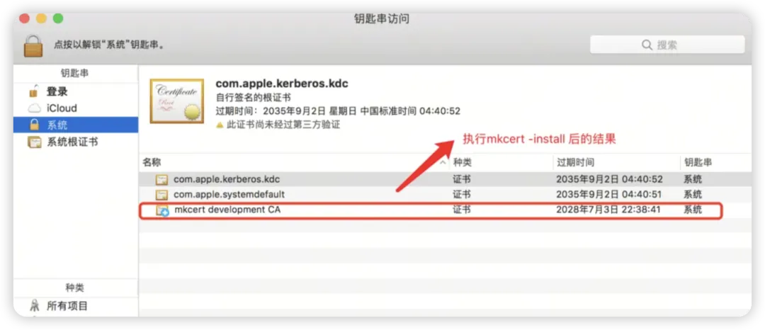 这个命令会在你的系统信任存储中安装一个本地CA证书,mkcert生成的所有证书都会被信任。