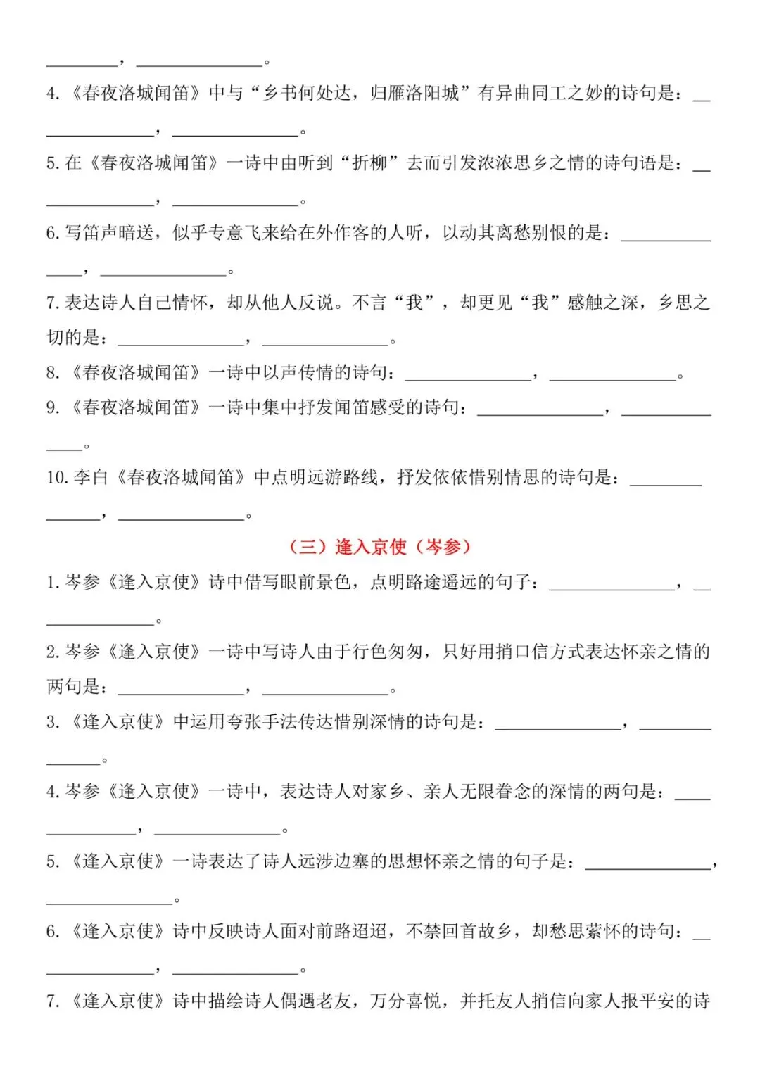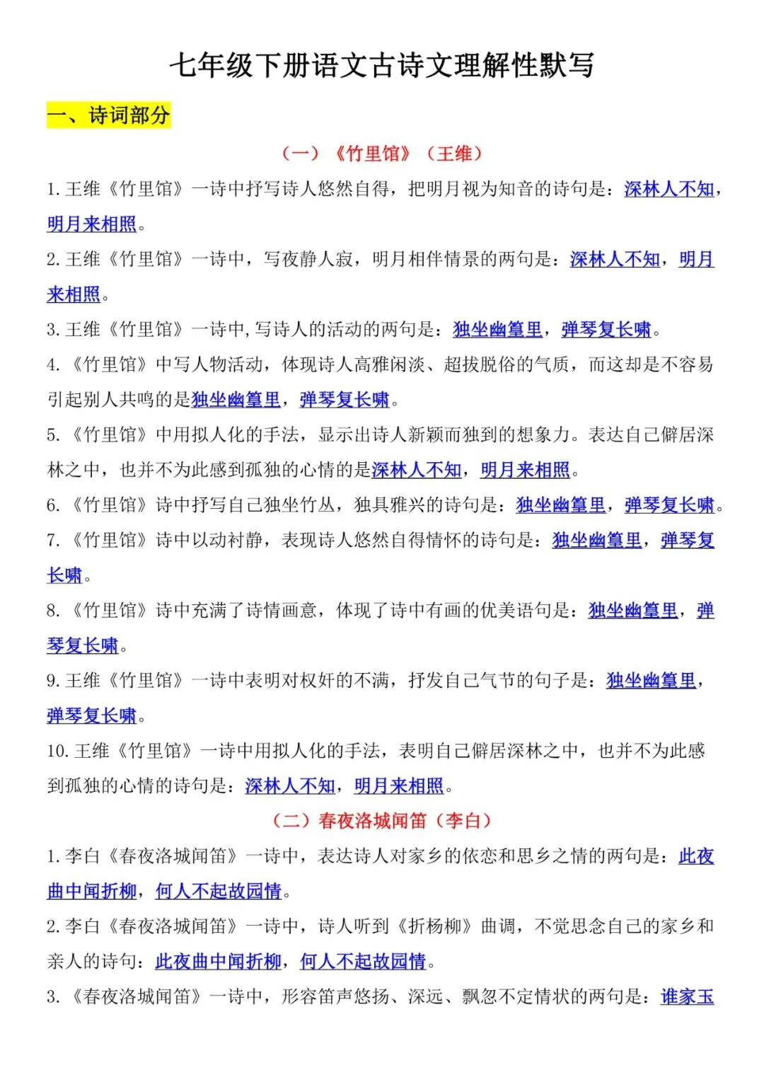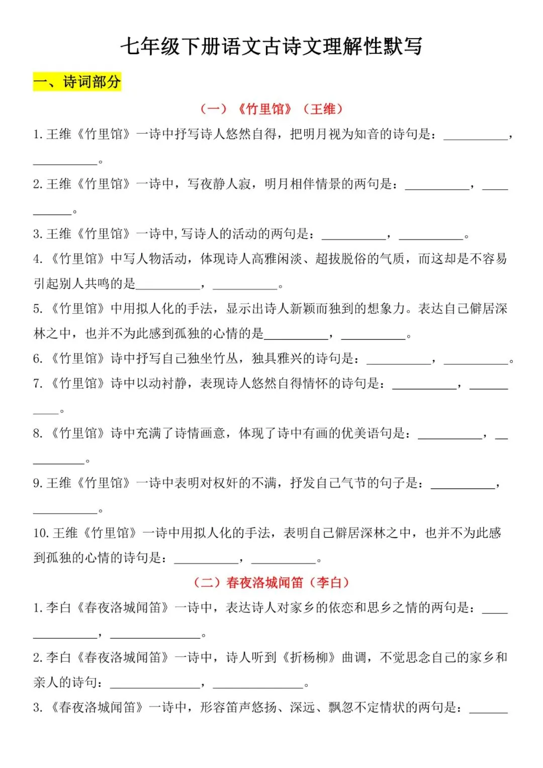 七年级下册语文古诗文理解性默写专项电子版可打印