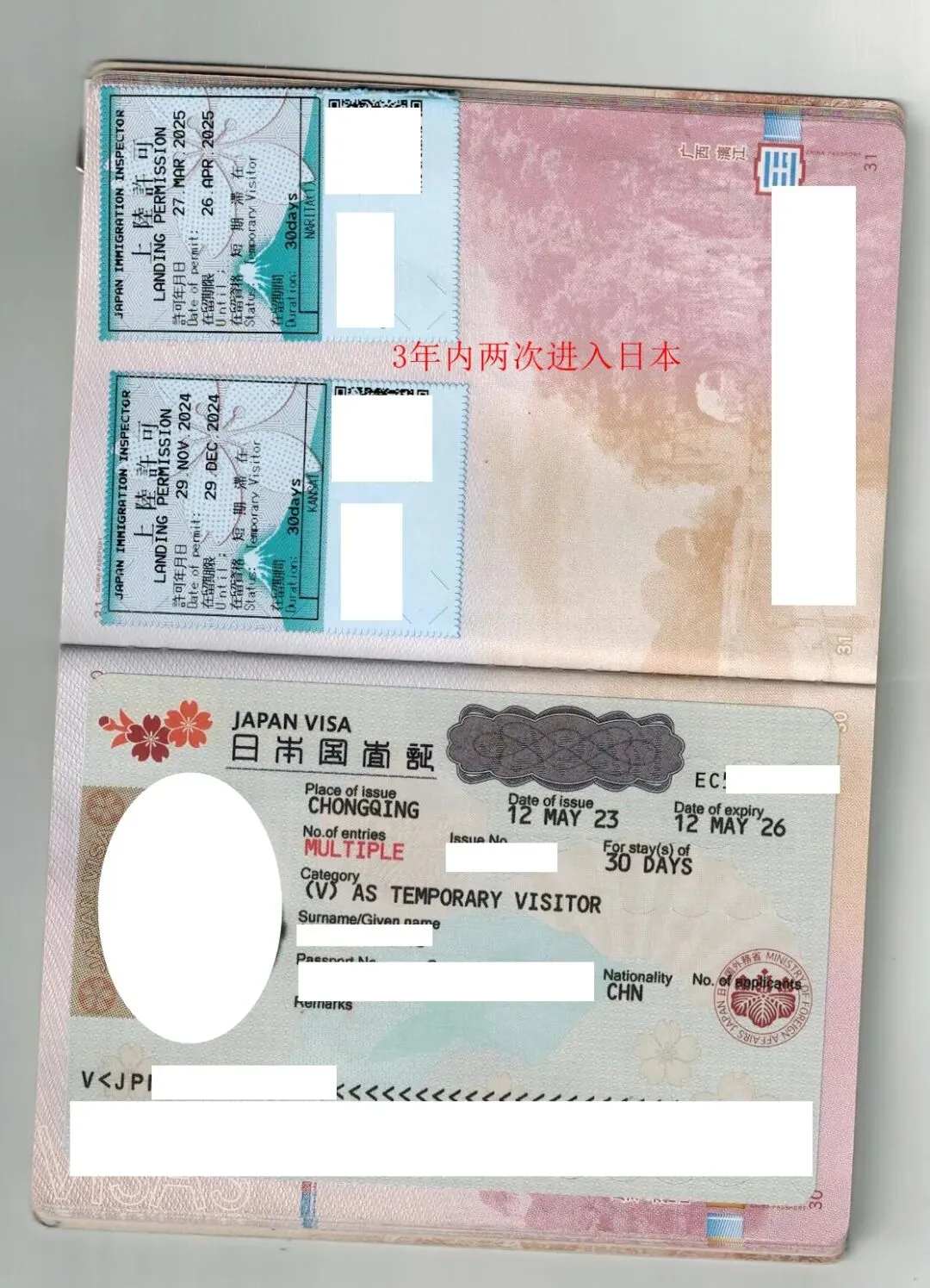 三年内使用2次去过日本,也可以再次使用签证页+2次入境记录,免财力办理三年签证;