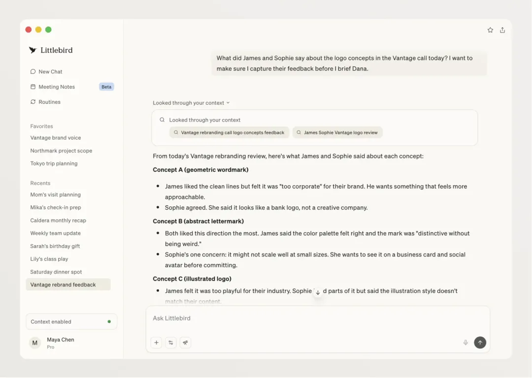 创始人Green分享了他的使用体验,我觉得特别能说明全上下文AI的价值。他每天都会问Littlebird”这周什么是重要的”或者”我应该专注于什么”,经常会收到令人惊讶且深思熟虑的答案。他用它来获取专业建议和指导,填补自己技术知识的空白,甚至用来规划晚宴。这些使用场景跨度很大,但共同点是:AI能给出有洞察力的答案,因为它深入了解你的生活。