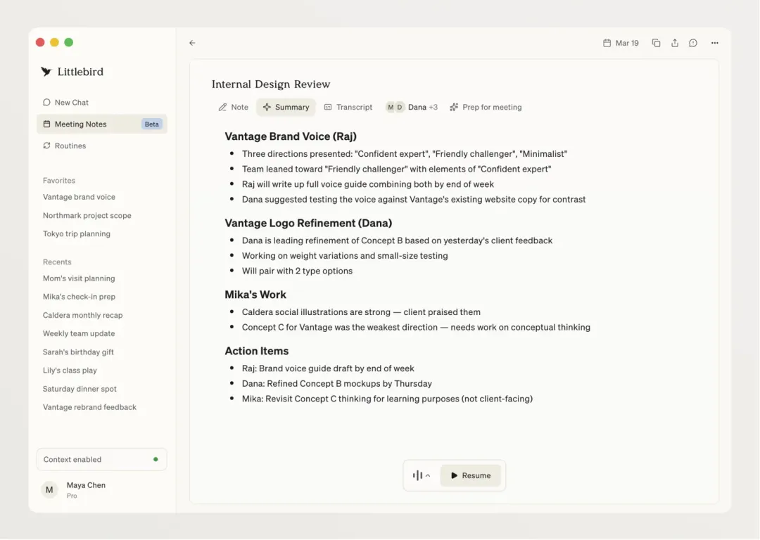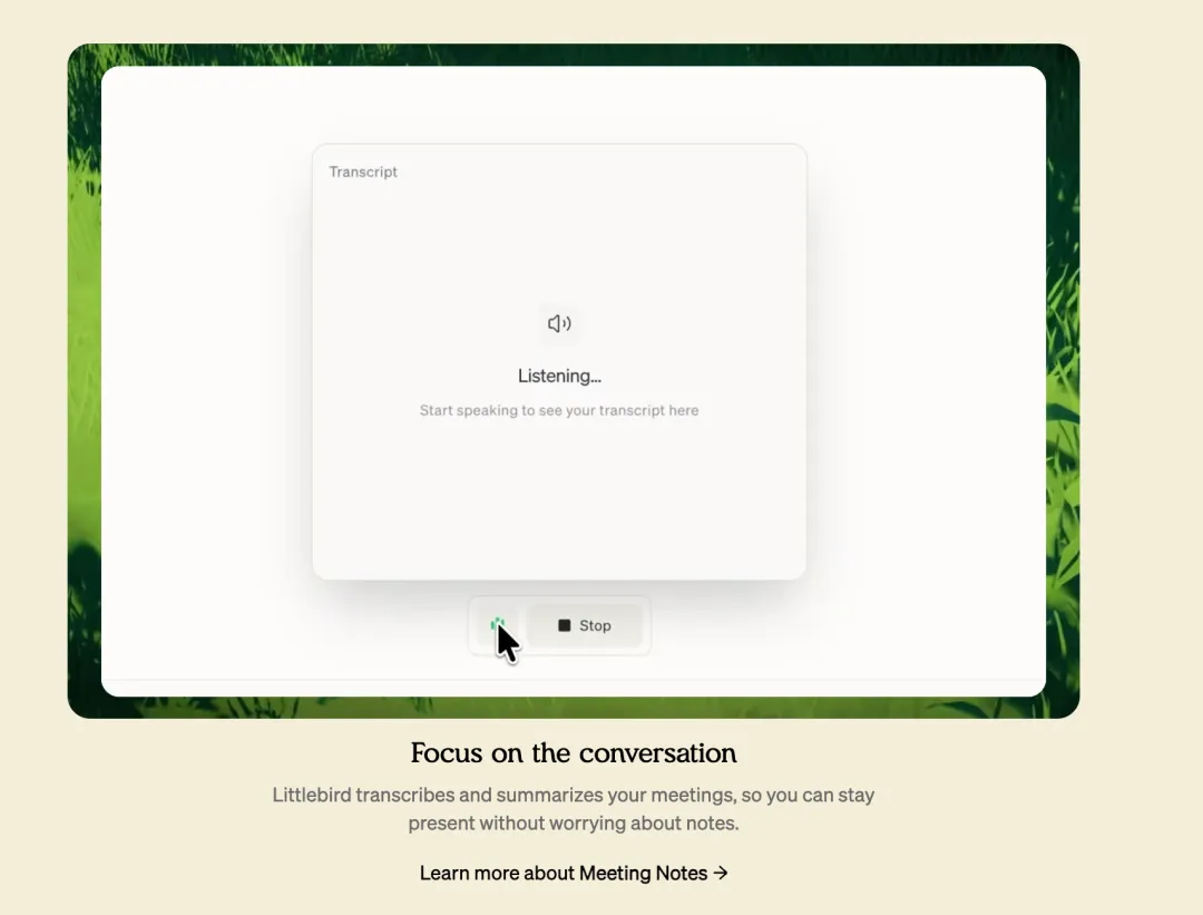 Littlebird内置了一个类似Granola的会议记录功能,使用系统音频在后台运行,捕获会议转录并根据内容创建笔记和行动项。这本身不算新奇,市面上有很多会议记录工具。但Littlebird的独特之处在于,它能够连接会议与你其他工作的上下文。