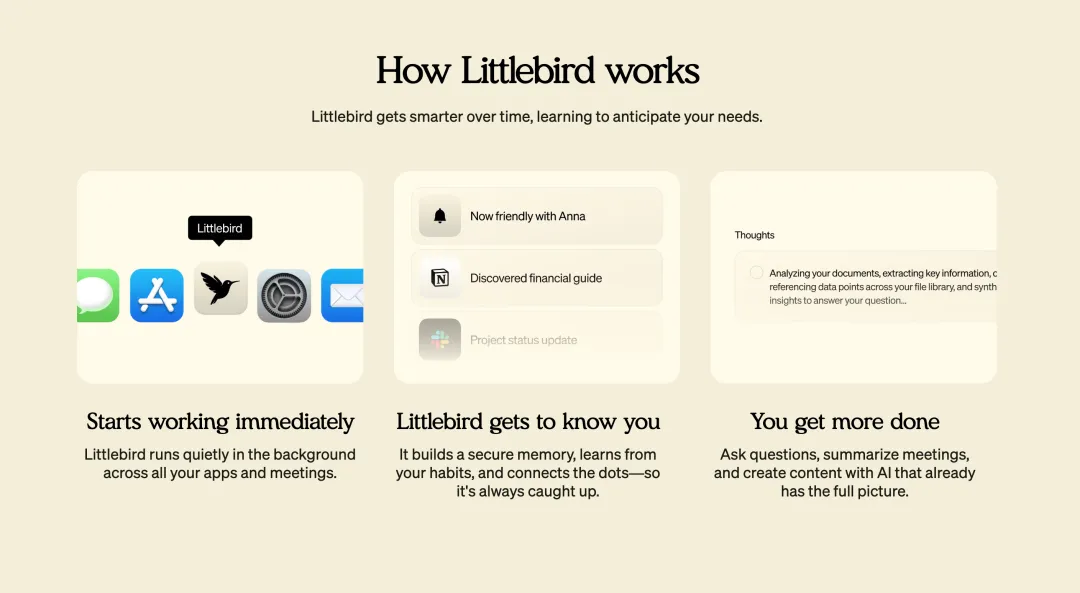 我最近体验了一个叫Littlebird的产品,它刚刚完成了1100万美元的种子轮融资,由Lotus Studio领投。这个产品让我重新思考了一个问题:AI助手到底应该是什么样子?它不应该是一个需要你不断”投喂”信息的工具,而应该是一个已经了解你工作和生活的助手。就像一个真正的助理,不需要你每次都从头解释项目背景、团队情况和工作进度。