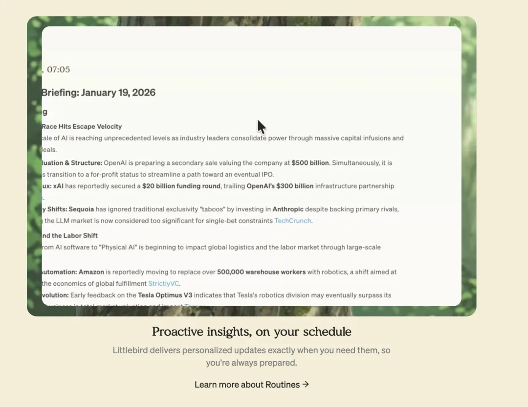 当AI真正拥有了关于你的完整上下文,使用体验会发生质的变化。我看到Littlebird提供的一些使用场景,让我意识到这不只是渐进式改进,而是一种全新的交互模式。