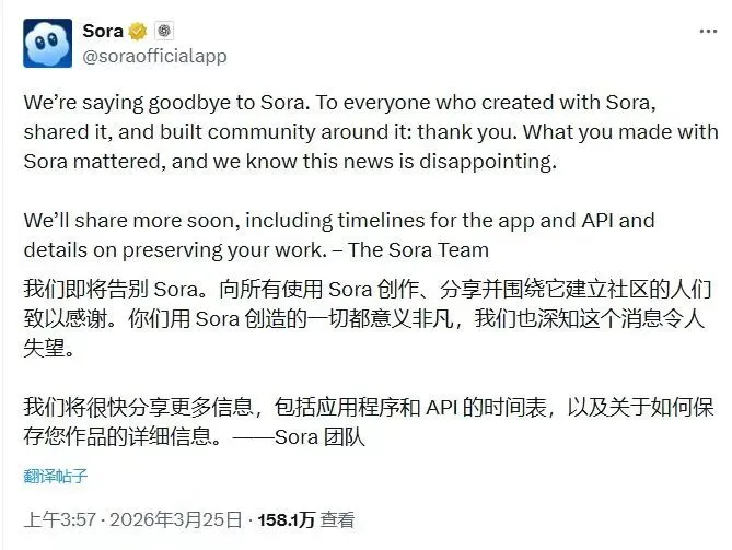 早上看到这个消息,手一抖。OpenAI旗下的AI视频生成工具Sora,正式宣布停止服务。