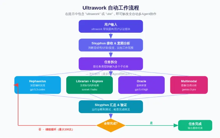 ▲ Ultrawork 工作流程:从用户输入到任务完成的全自动循环