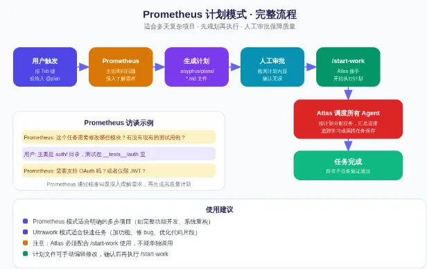 按 Tab 键或输入 @plan 任务描述,Prometheus 会主动问你几个澄清问题来深入了解需求,然后生成一份结构化计划文件(保存在 .sisyphus/plans/*.md 里)。你审阅确认后执行 /start-work,Atlas 接手按计划调度所有 Agent。