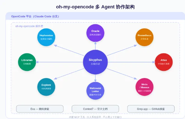 以 Sisyphus 为核心的多 Agent 协作架构,底部为内置 MCP 工具
