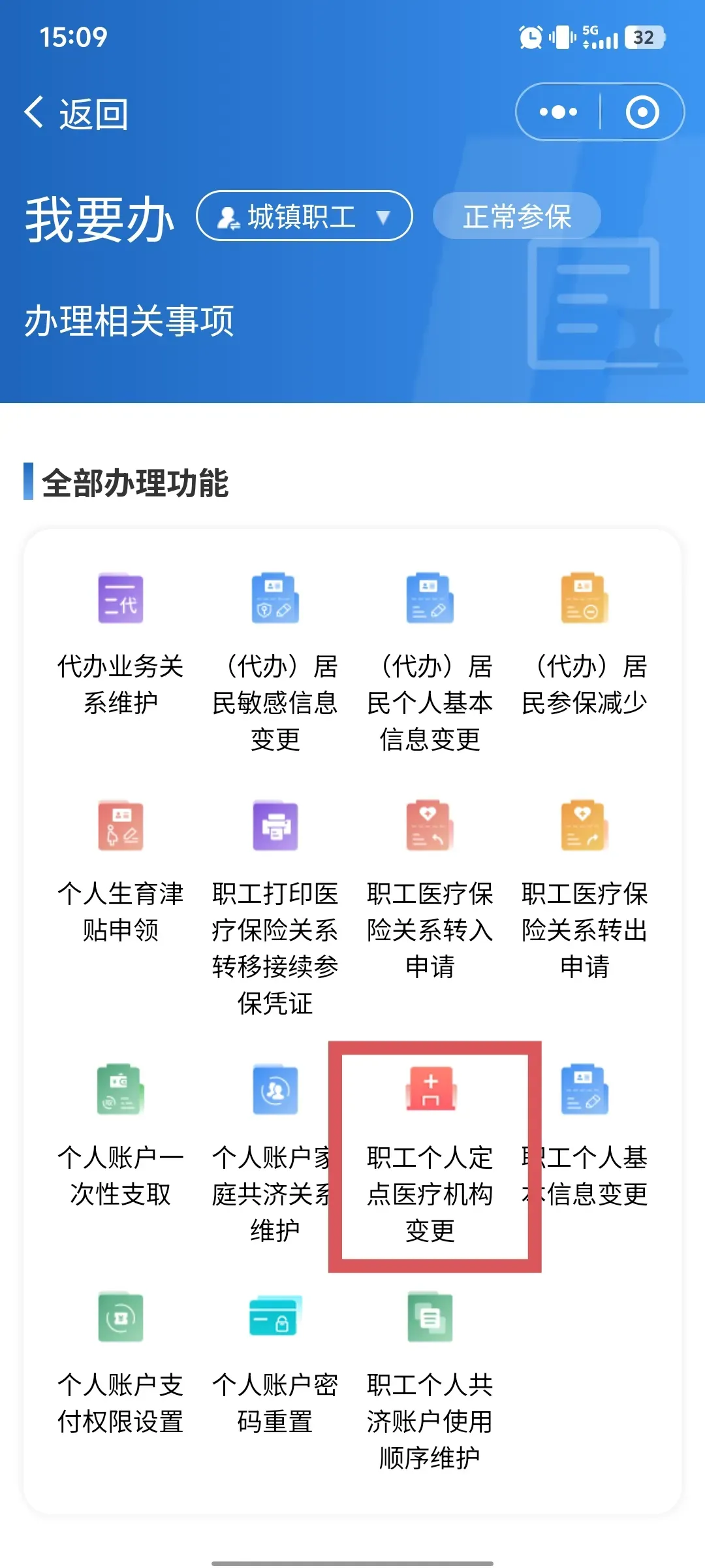 2.点击【我要办】模块,进行定点医疗机构变更(城镇职工——进入“职工个人定点医疗机构变更”、城乡居民——进入“居民个人基本信息变更”);
