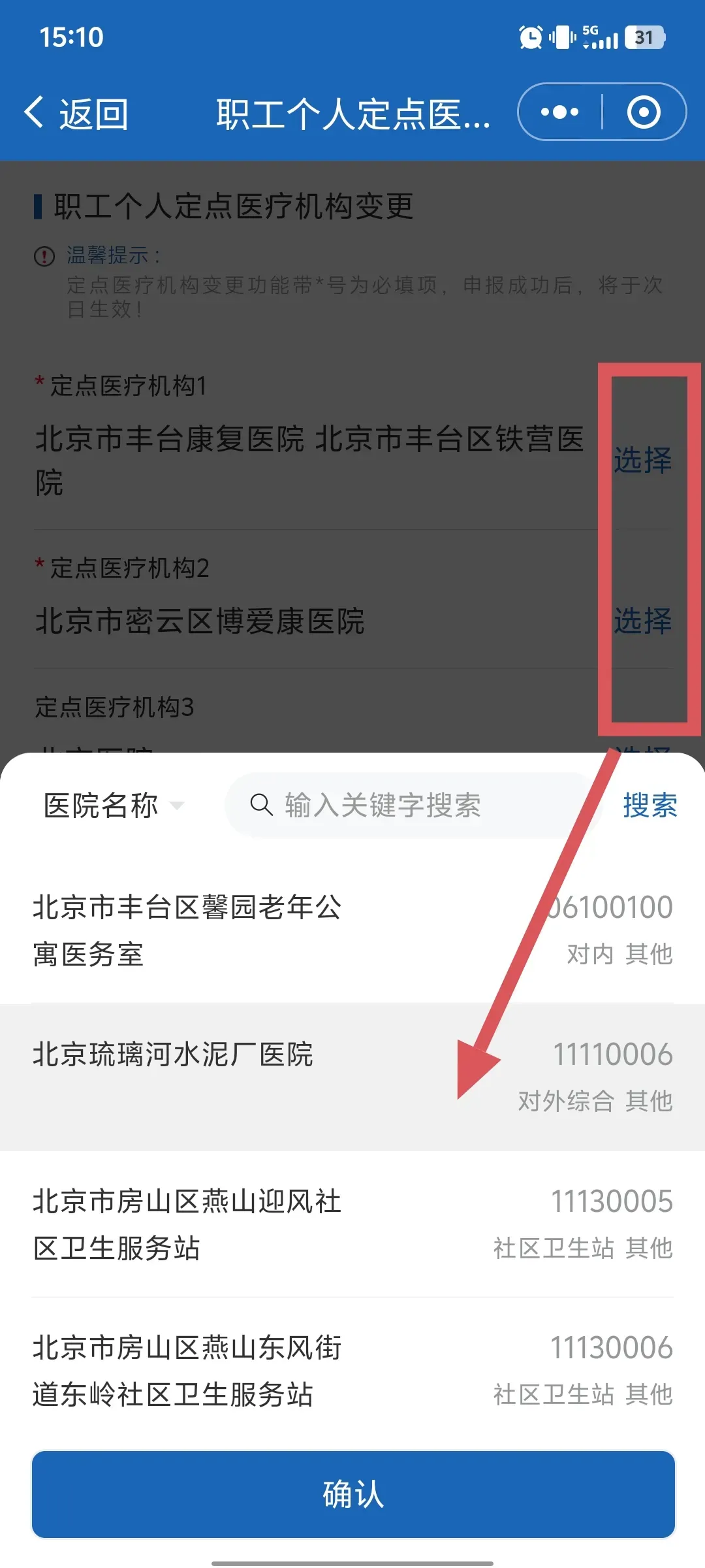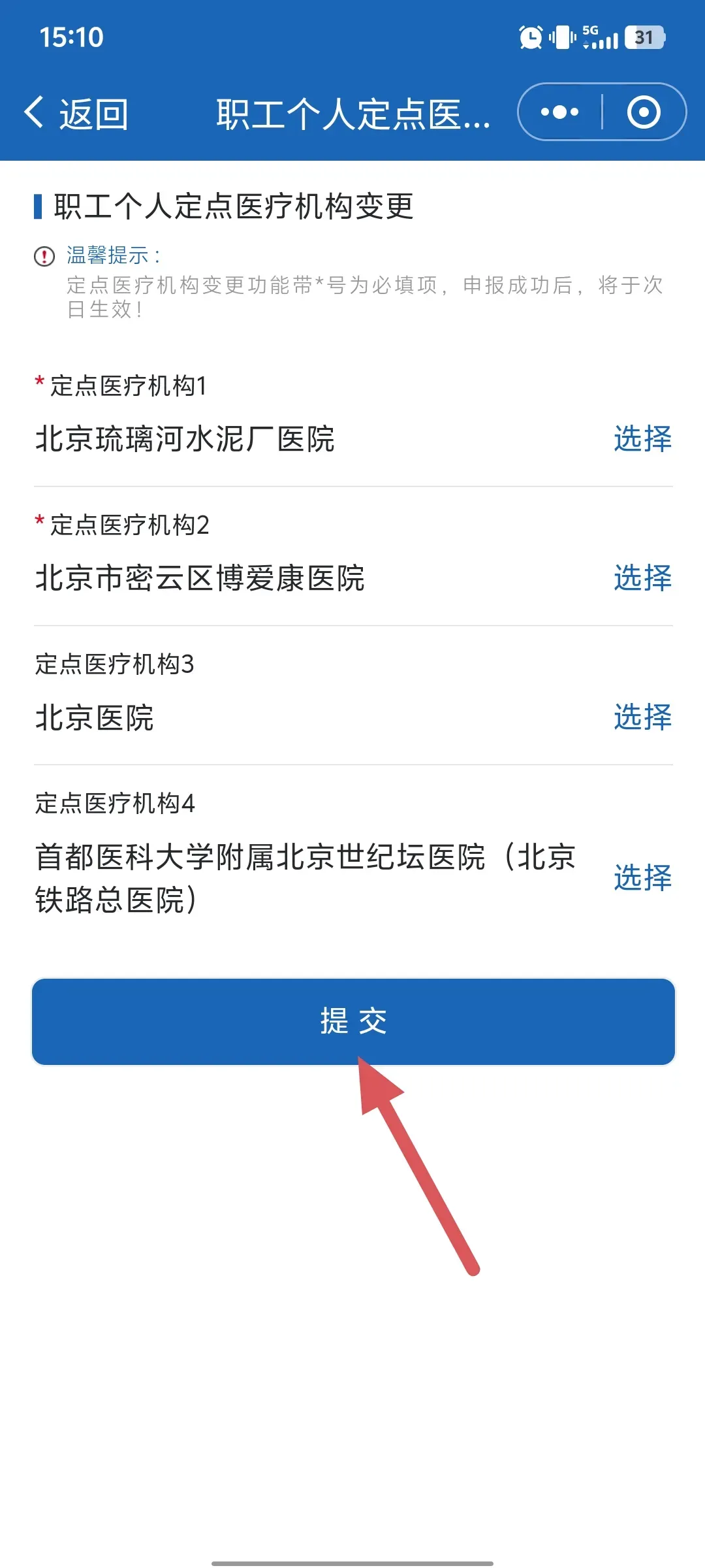 本市参保人员首次参保时,可选定3-4家本人的定点医院,根据自己使用情况,可对选定的定点医院进行变更。参保人员线上可通过“京通”小程序、“北京医保公共服务平台”、国家医保服务平台APP进行自主办理变更。