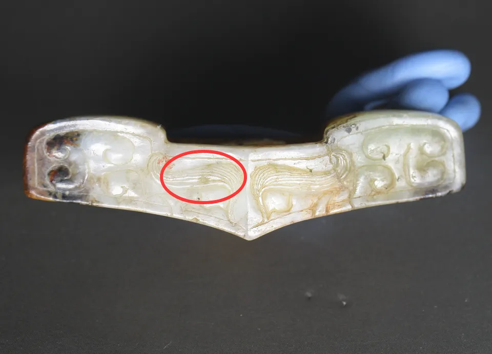 重现汉代治玉工具 ——“昆吾刀” 重现汉代治玉工具——昆吾刀 我们在观察定州博物馆一件汉代玉剑格时 发现剑格兽面眉毛处的工痕 并不是砣具完成的 如下图 汉代玉剑格观察点 放大30倍效果,如下图 这种阴线明显不是金属砣具完成 那就可能是徒手划刻的 但这件玉剑格的玉料是和田玉 硬度可达莫氏6.5度 石英石一类的工具也就莫氏7度 这件玉器的阴线看起来是一气呵成的 需要工具的硬度达到莫氏9-10度或者更高 才会有这种效果 那就有可能是一种传说中的工具“昆吾刀” 我们来模拟一下 先找到一件金刚石的磨具,如下图 硬度可达莫氏10度 再找到一块透闪石玉板,硬度莫氏6 开始徒手划刻 不需要反复的划刻,蹭几下,效率很高 一条较深的阴线就划出来了 放大30倍,见下图 这和定州博物馆那件玉剑格的阴线 非常的相似,线条效率非常高 所以我们可以猜测,当时的昆吾刀 就是自然界的金刚石 《汉代玉器工痕真伪对比图谱》PDF图文版 关注我们