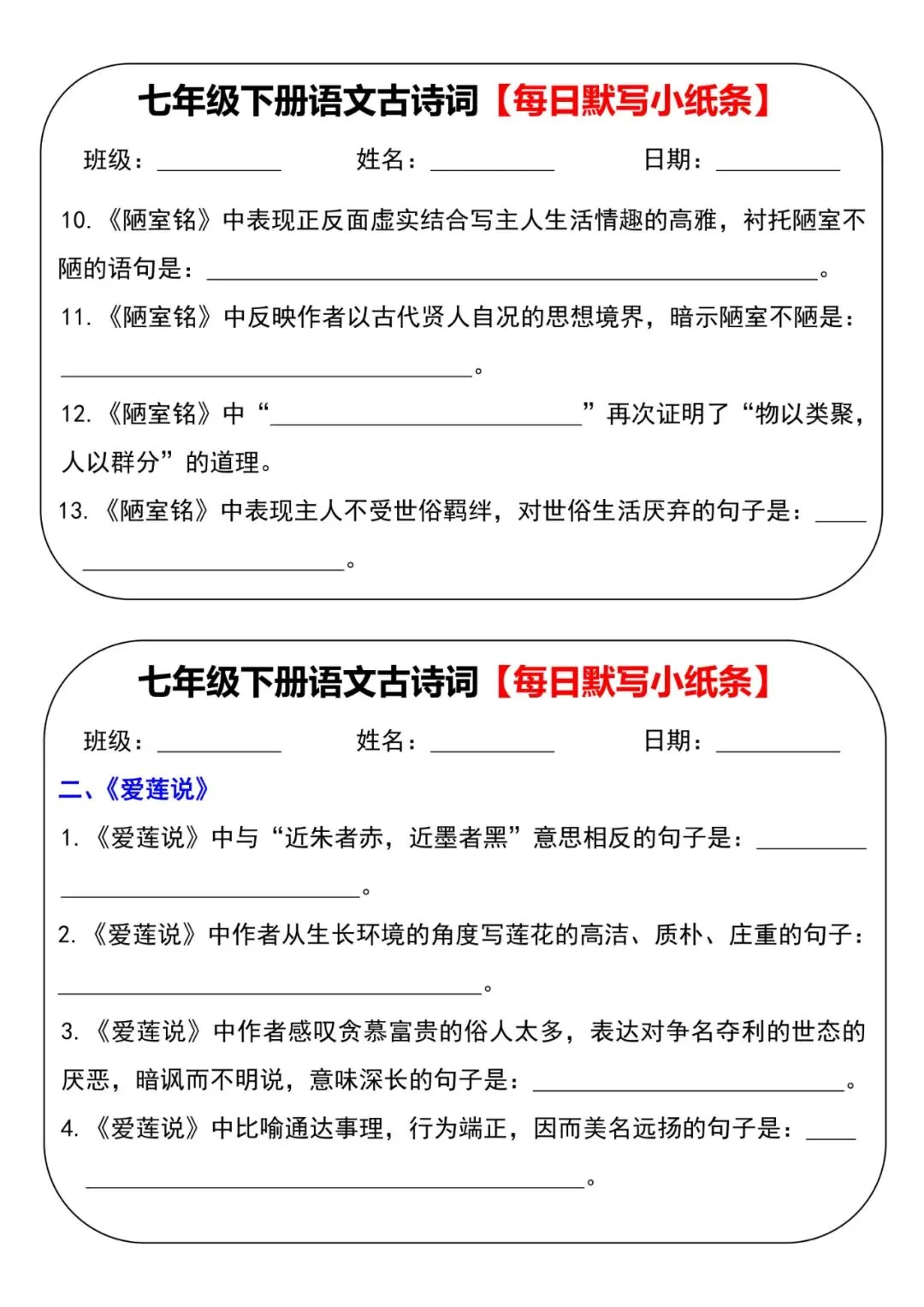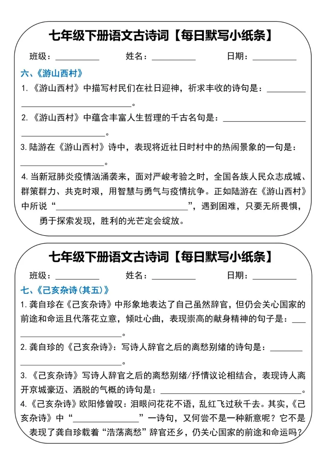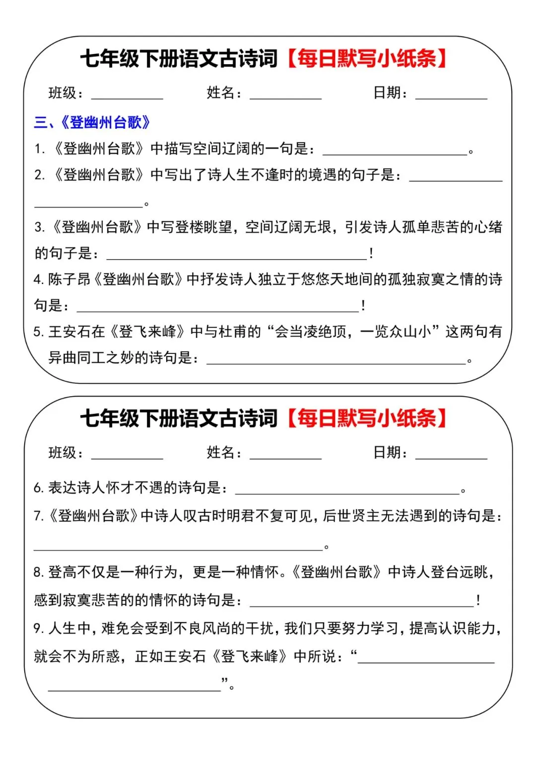 七年级下册语文古诗词每日默写小纸条电子版可打印