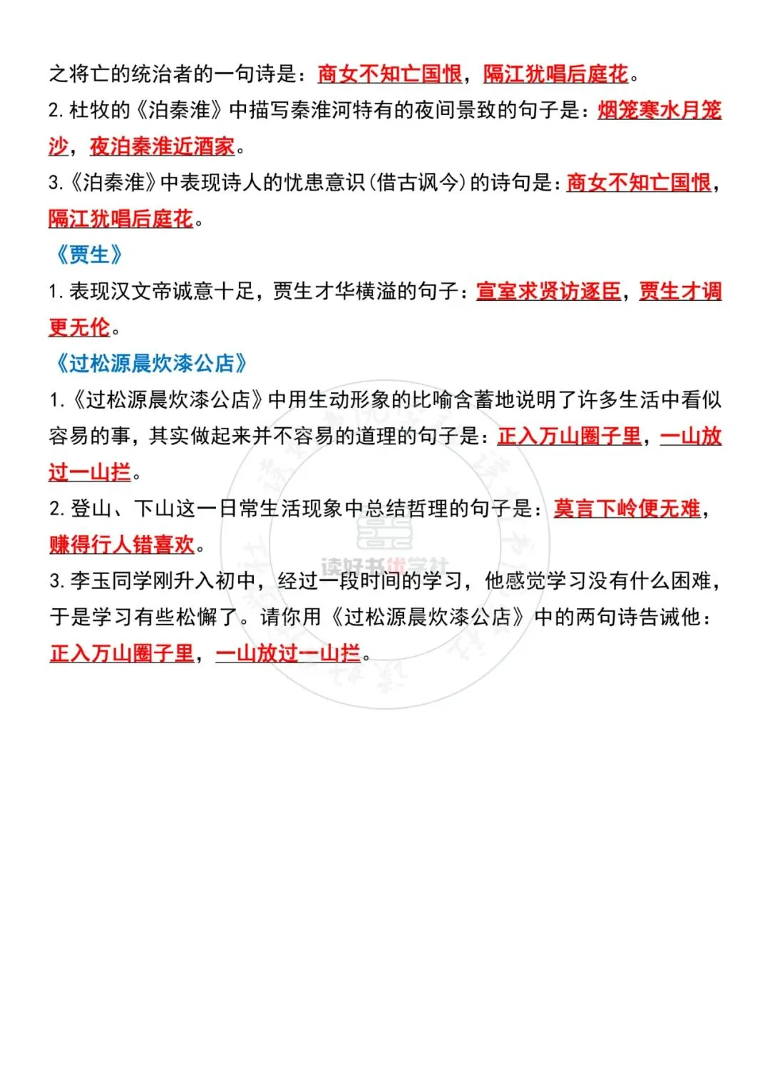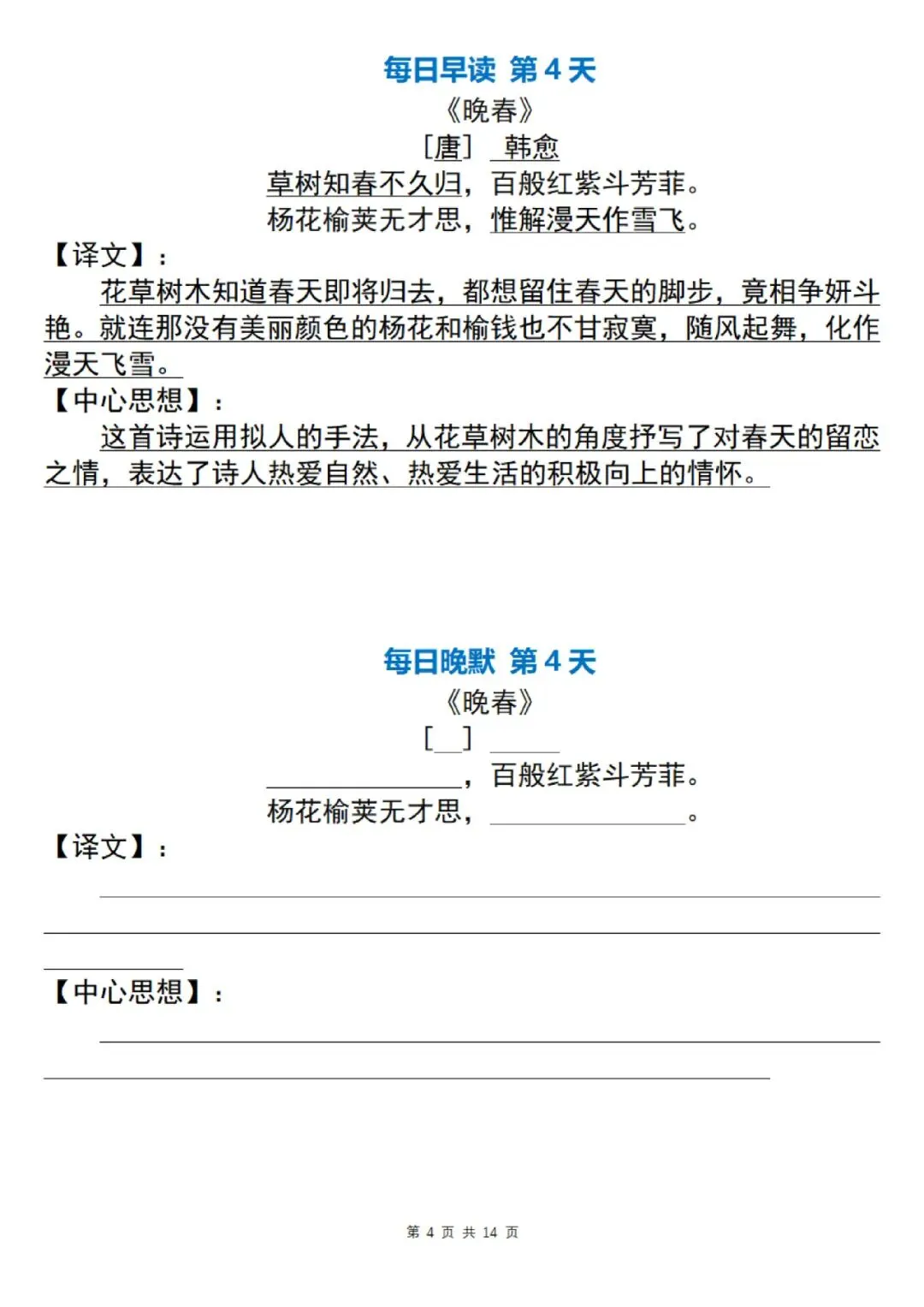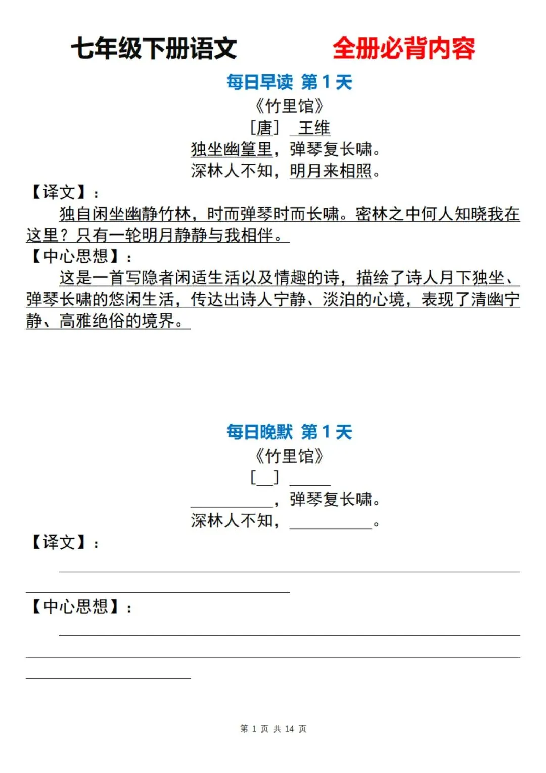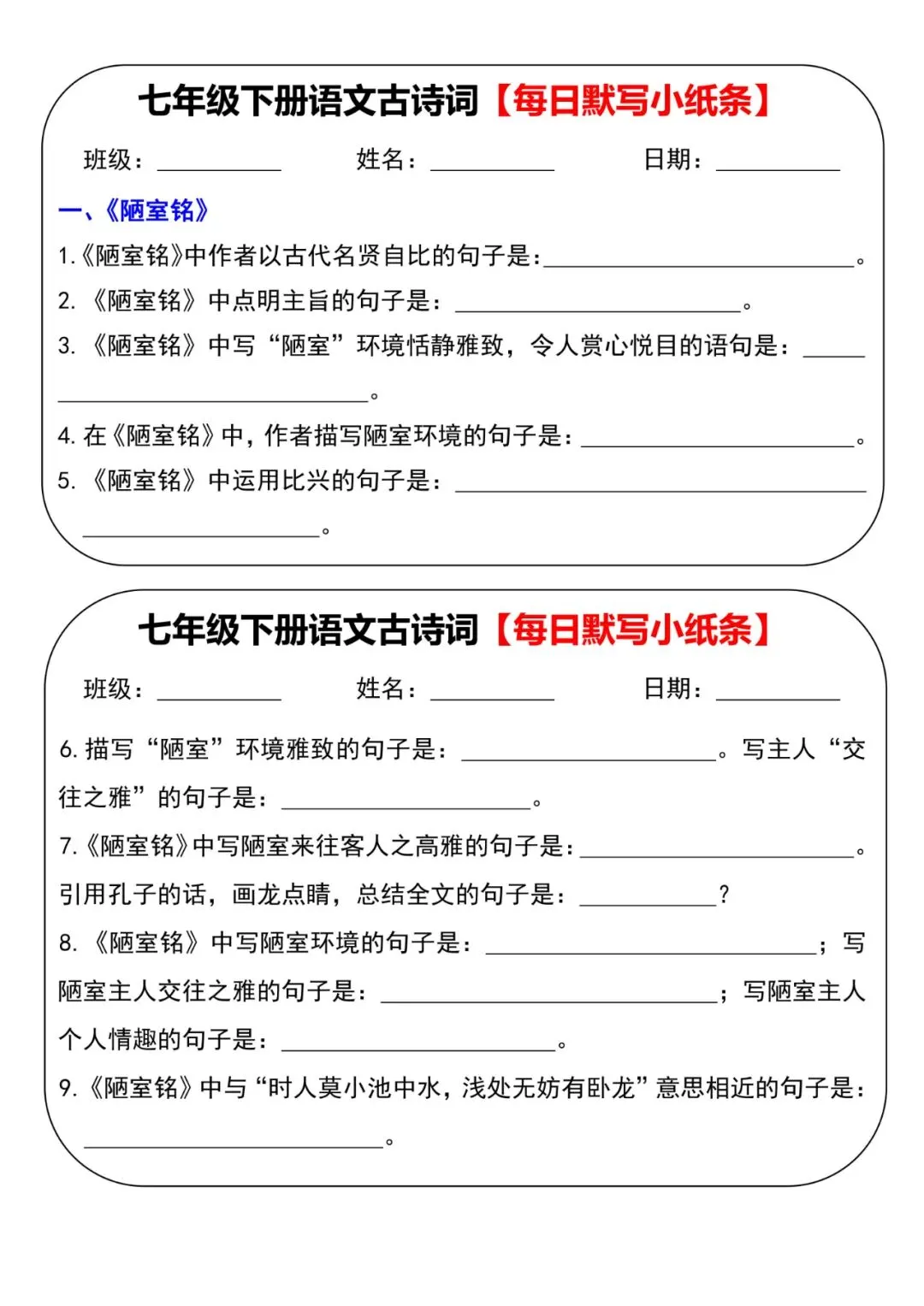 七年级下册语文古诗词每日默写小纸条电子版可打印