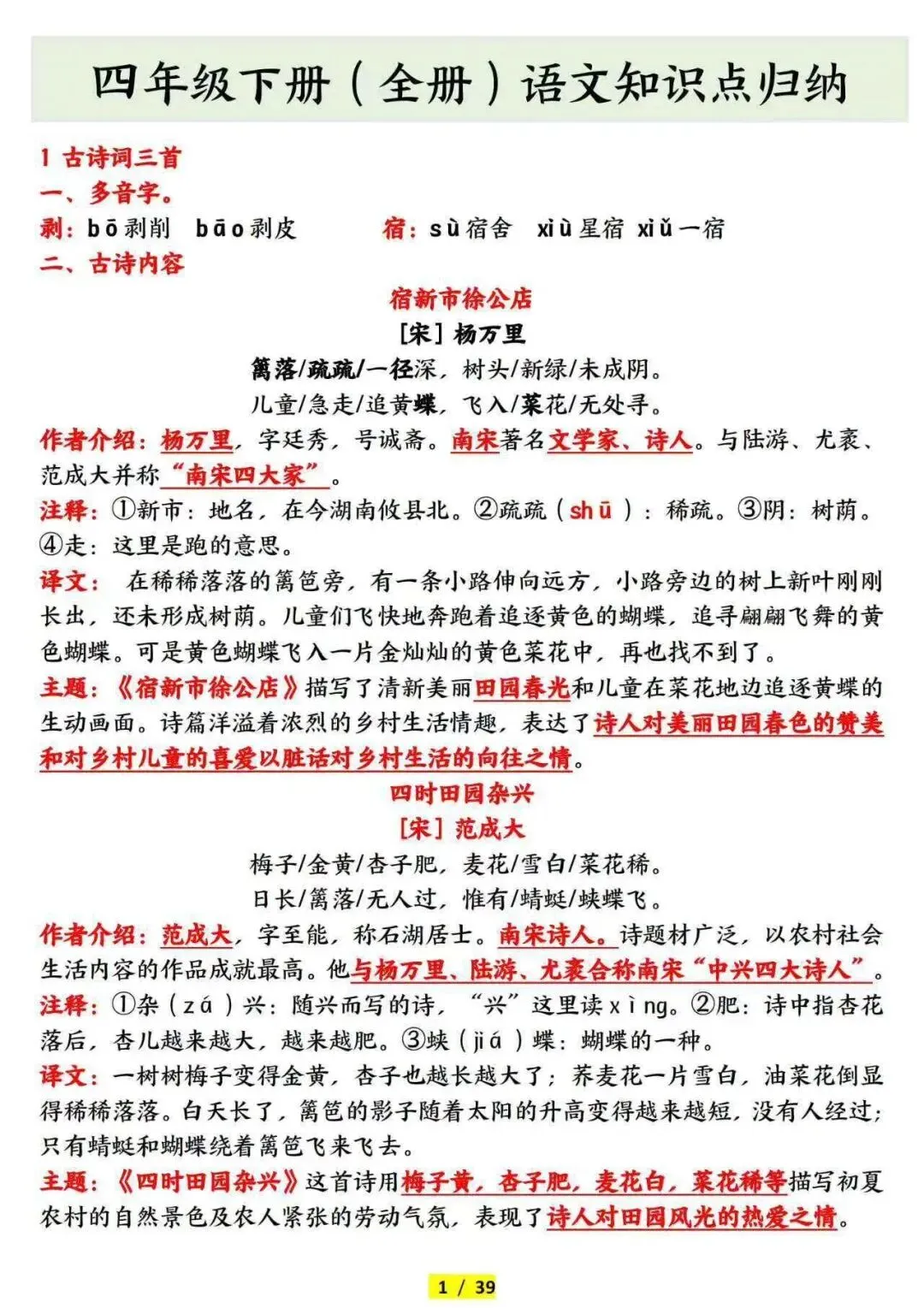 孩子语文复习没头绪,课文、字词、古诗散落各处?别焦虑!这份由资深老师内部整理的《四年级下册语文全册知识点归纳》PDF,帮你把一学期的重点一网打尽,是期末复习和预习的“救急神器”!