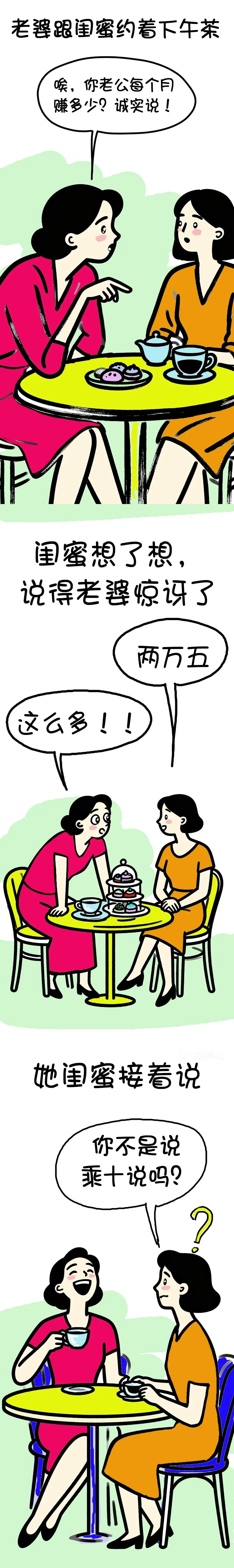 趣味漫画:老婆问闺蜜老公赚多少,她说2万5,本以为是凡尔赛现场,老婆刚羡慕她闺蜜接着说,老婆听完笑到喷茶! 巧 问 妙 答 1.用什么拖地最干净? 2.盲人怎样吃橘子? 3.太阳和月亮在一起是哪一天? 把您的答案分享到评论区吧