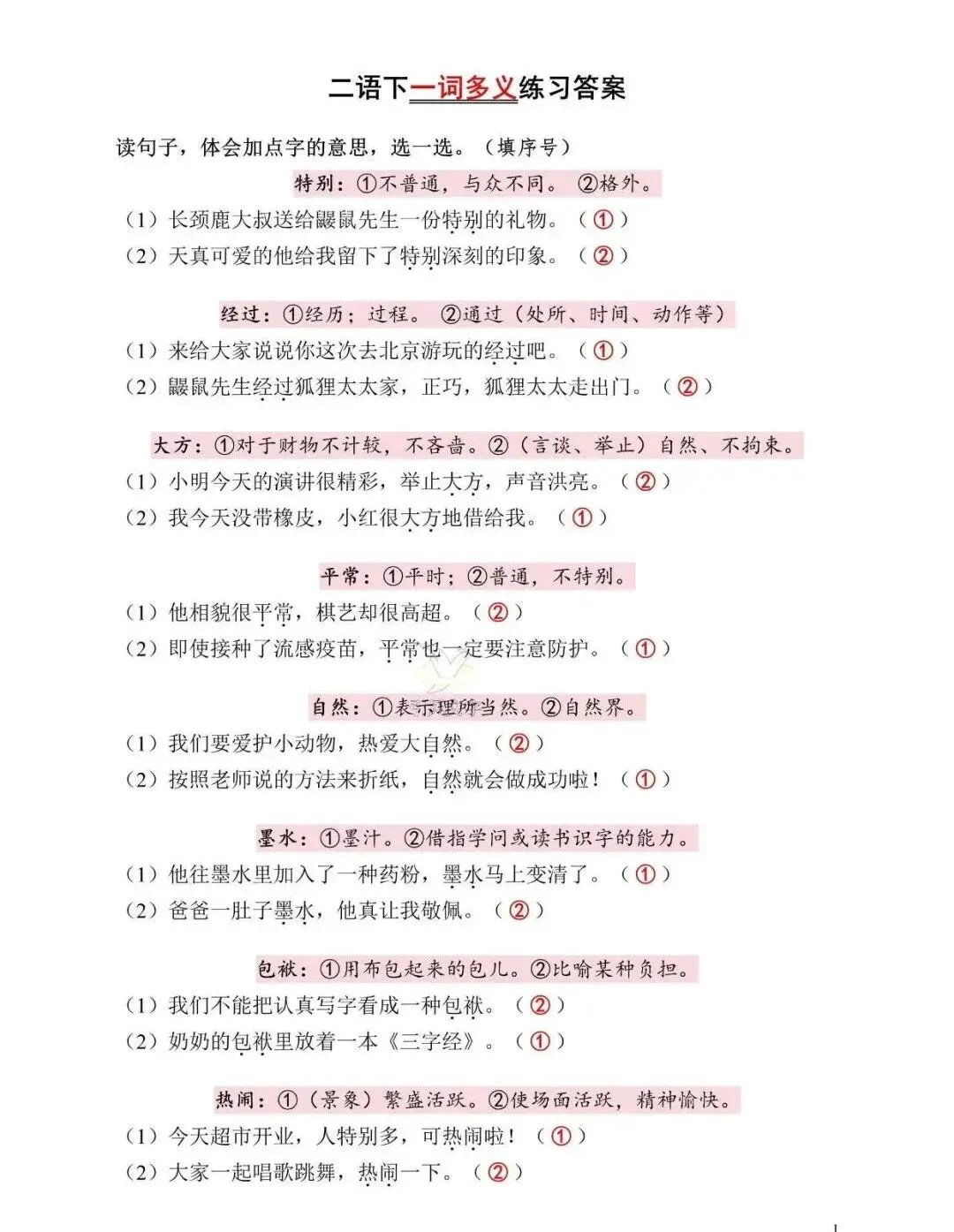 二下语文一词多义练习(含答案)(电子版) 今天给大家分享的是二下语文一词多义练习(含答案),覆盖课堂常考、考试常出的多义词语,题型由浅入深,循序渐进帮孩子理清词义差异。 内容截图预览 限时免费领取: (公众号发文24小时内) 公众号对话框中发送关键字:2244