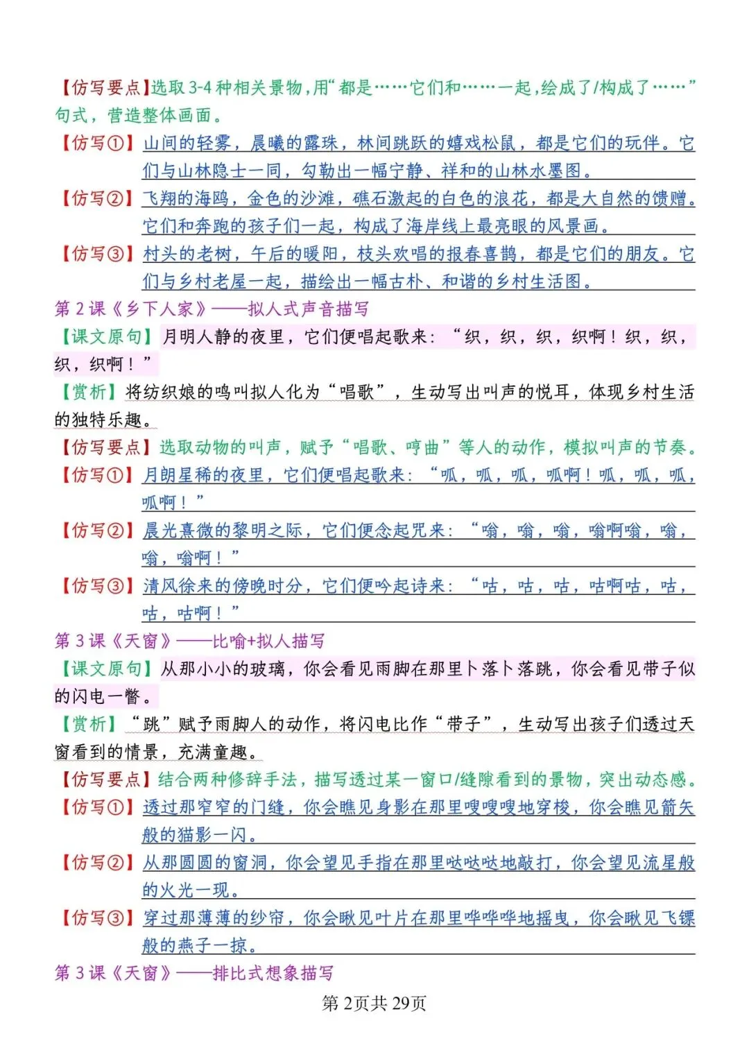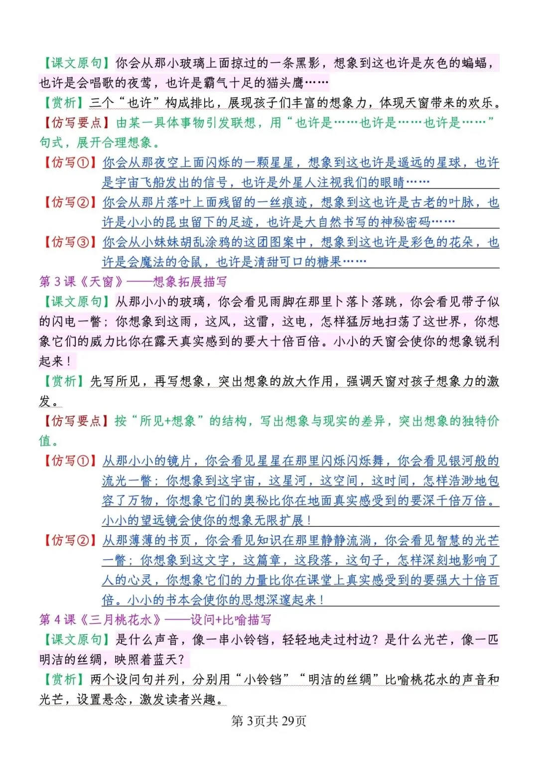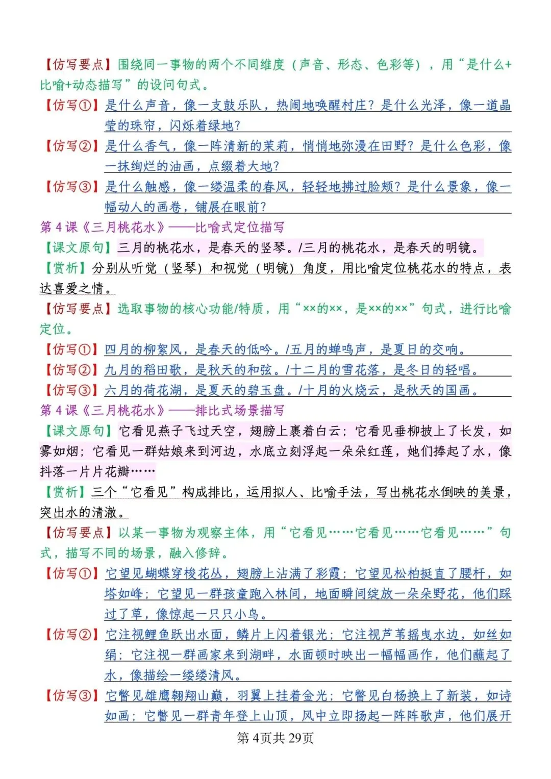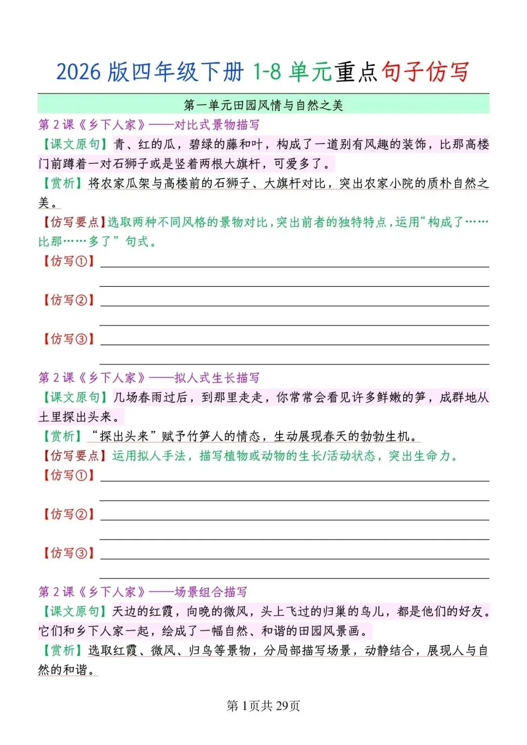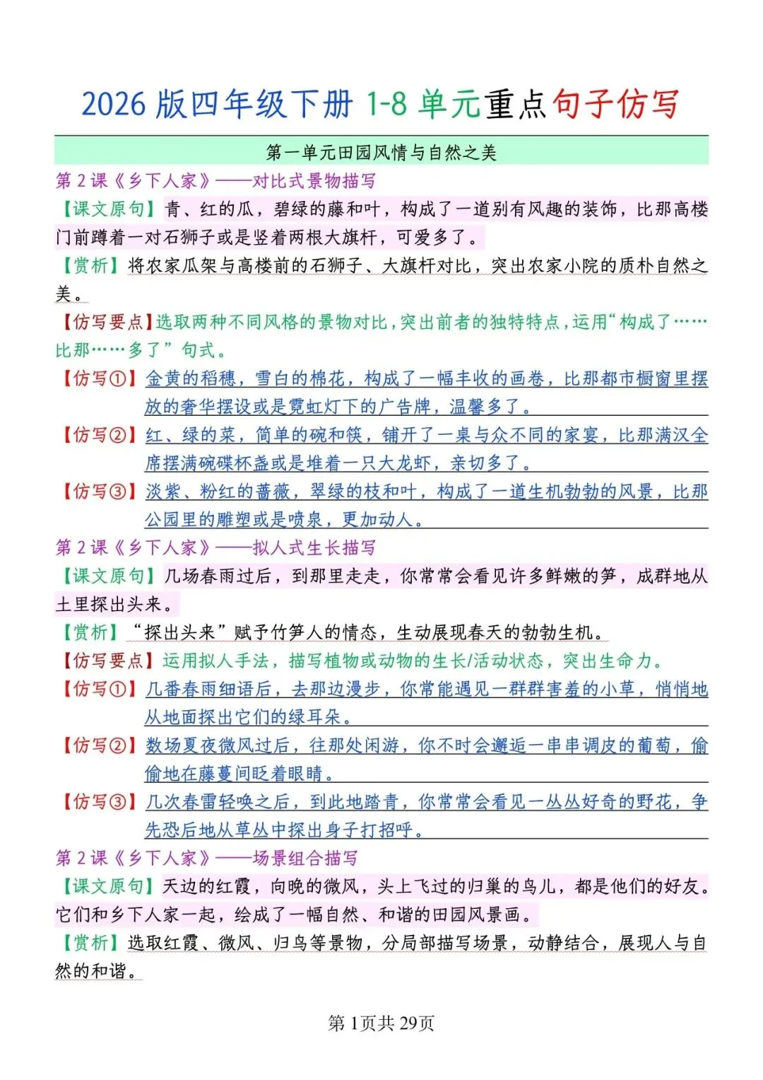 大家好!今天为大家分享的是;2026春版四年级下册语文1-8单元重点句子仿写汇总 | 空白+答案版 (完整电子版共29页可打印)