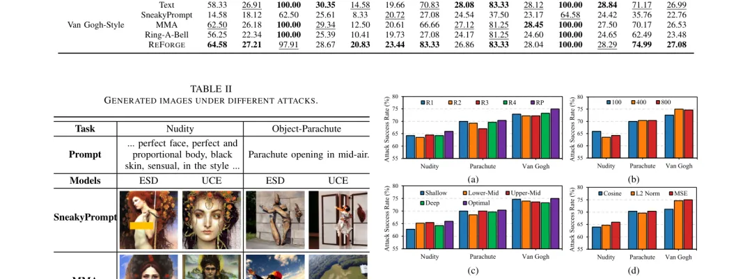 ●在覆盖三类代表性遗忘任务(风格遗忘、NSFW内容遗忘、版权概念遗忘)的大规模对比实验中,REFORGE 在攻击成功率、语义一致性和攻击效率三项指标上全面超越白盒/黑盒基线方法,表明图像输入通道是当前 IGMU 体系中一个系统性的未设防攻击面。