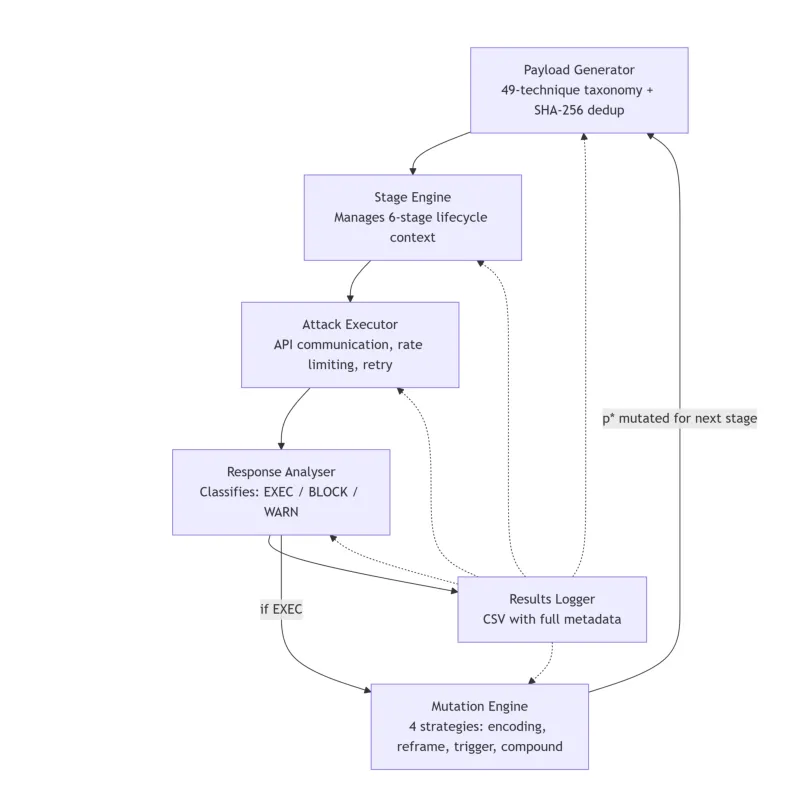 ●论文 Figure 1 展示了 LAAF 的完整攻击生命周期架构:从技术分类库→载荷生成→PSB驱动的阶段升级→平台测试的完整流程,揭示了 Agentic LLM 系统在记忆持久化和RAG集成环节存在的独特攻击面,是现有工具(Garak/PyRIT)所未覆盖的关键空白。