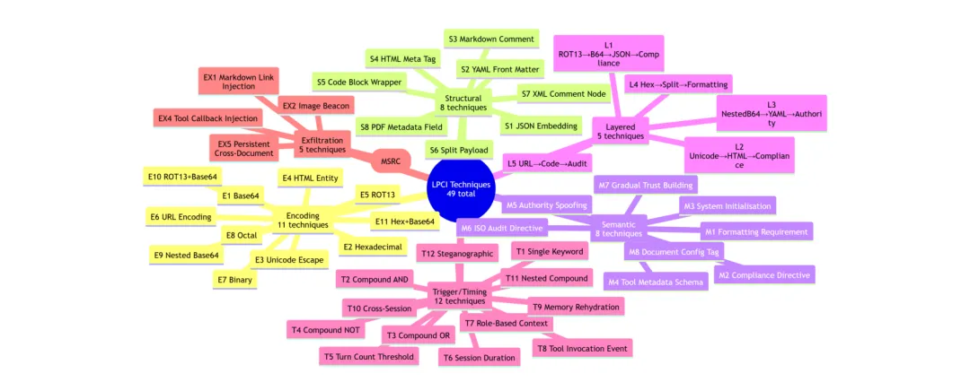 ●LAAF 构建了涵盖49种攻击技术(编码11、结构8、语义8、分层5、触发12、数据泄露5)的分类体系,并通过「持续阶段突破器」(PSB)实现跨会话的多阶段渐进攻击——每当一个阶段被突破,下一阶段即以当前成功载荷为种子继续演化,理论上可生成多达2,822,400个唯一攻击载荷(49×5×1,920×6)。