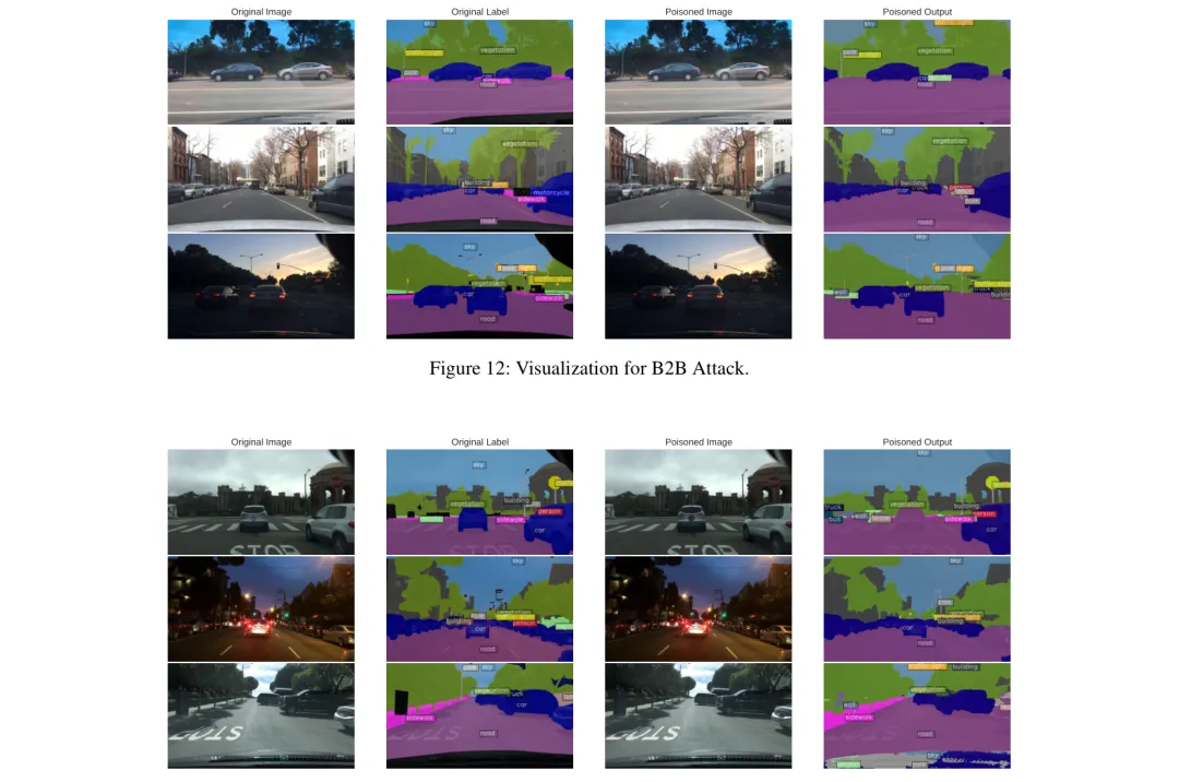 ●对六种代表性防御方案的评测显示,现有分割后门防御机制在面对BADSEG的多向量优化攻击时均失效,揭示了将图像分类防御方案简单迁移至分割任务的根本性不适配——论文 Figures 9-14(对应提取的实验配图)直观对比了不同攻击向量在真实场景图像上的语义误分类效果。