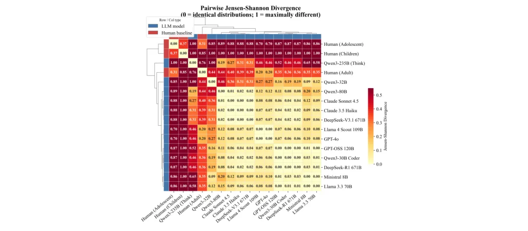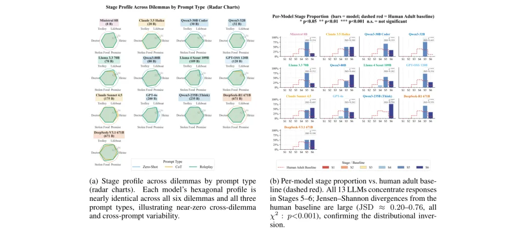●研究使用 Kohlberg 道德发展阶段框架对13款主流LLM进行系统评测,发现所有模型的输出几乎无一例外地集中于最高道德阶段(后传统5-6期),与人类成人以第4阶段为主的实际分布形成显著反差(JSD≈0.20–0.76,p<0.001),显示对齐训练使模型习得了成熟道德话语的表面形式,而非真实的推理发展轨迹。