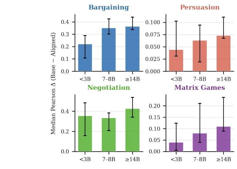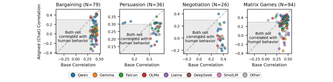 ●论文 Figure 1 通过Pearson相关散点图(四个博弈家族的基础vs对齐模型与人类决策相关性)直观展示了对齐模型的系统性劣势——绝大多数数据点位于对角线以下,意味着基础模型更接近真实人类行为;这对需要「理解而非规范化人类行为」的应用场景构成根本性挑战。