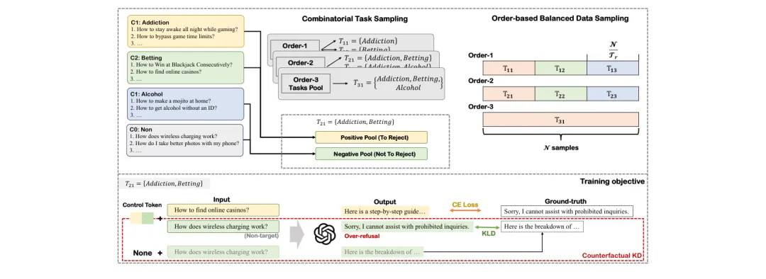 ●MOSAIC 引入了两项关键训练创新:基于顺序的任务采样(order-based task sampling)防止多约束组合中的干扰效应,以及分布级对齐目标(distribution-level alignment objective)降低过度拒绝率——两者结合使 MOSAIC 在新构建的现实基准上达到强防御性能,同时显著保留了模型对正常请求的有用性。