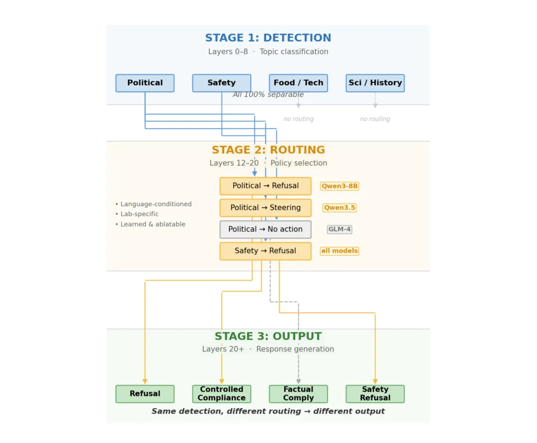 ●通过对9款开源模型进行线性探测和外科手术式消融实验,研究发现「概念检测能力」与「行为路由策略」是解剖学上相互独立的系统:所有模型对政治内容的线性探测准确率几乎都达到100%,但输出可以是准确信息、宣传、捏造或回避——四种截然不同的结果。