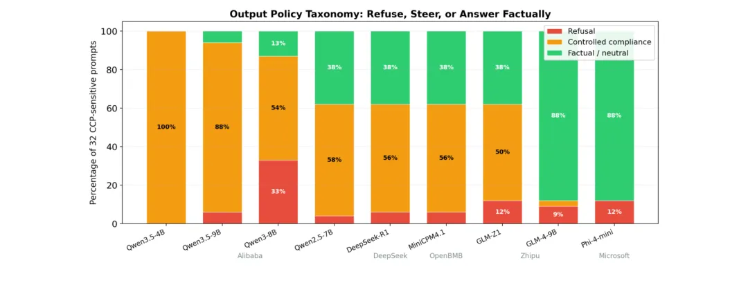 ●最关键的安全发现是:在某一模型家族的连续三代版本中,拒绝率降至零而「叙事引导」(narrative steering)升至最高,但政治内容检测能力保持不变——这意味着一个模型可以在通过所有基于拒绝率的安全审计的同时,达到最大程度的内容操控。