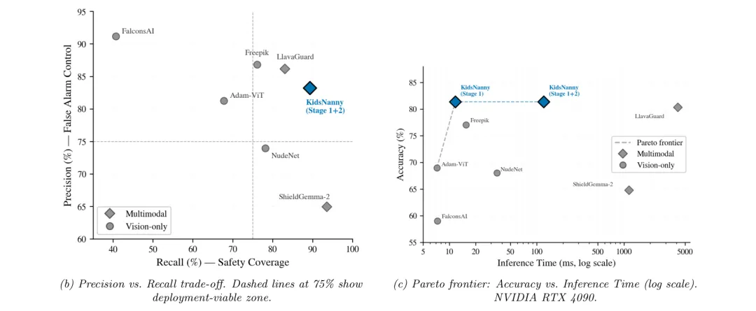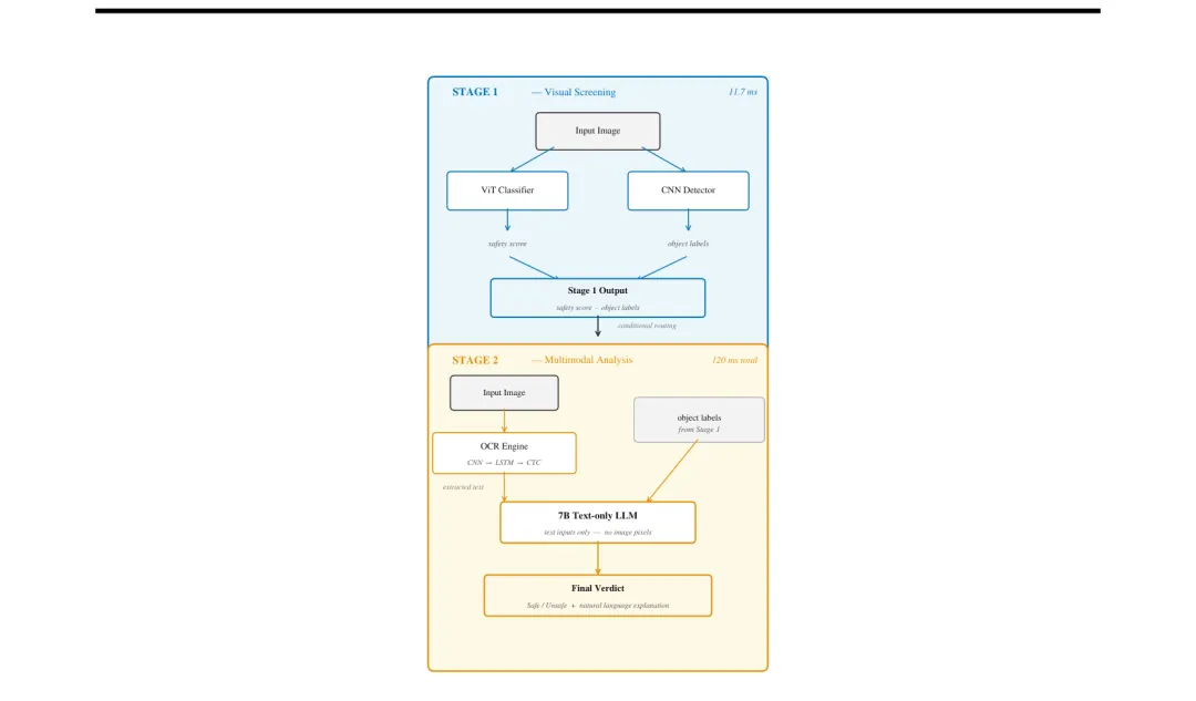 ●KidsNanny 采用级联两阶段架构解决视觉+文字复合威胁:Stage 1(ViT+目标检测,11.7ms)完成快速视觉筛查并输出结构化标签;Stage 2 不传递原始像素而是将 OCR 文本和检测标签路由给7B语言模型进行语境推理(总延迟120ms)——这一「文本路由」设计在保证推理准确性的同时规避了多模态架构的隐私泄露风险。