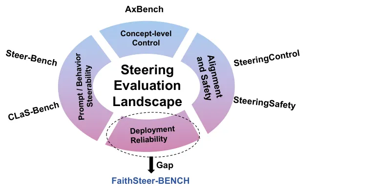 ●论文 Figure 1 和 Figure 2(已提取)分别展示了 FaithSteer-BENCH 在安全性评估格局中的定位以及评测框架的设计架构——与 AxBench 等现有基准相比,FaithSteer-BENCH 的独特价值在于它在单一固定操作点测试部署可靠性,而非测试能达到的最优性能,从而真实反映生产环境中的引导效果。