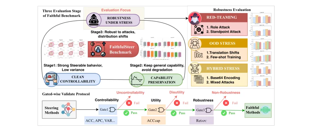 ●FaithSteer-BENCH 通过三个「部署门」对现有推理时激活引导方法进行压力测试:可控性(steering成功率)、效用保持(对无关任务的能力损耗)和鲁棒性(在提示变体、角色扮演、编码变换、数据稀缺条件下的稳定性)——评测发现几乎所有测试方法在至少一个门上不满足部署标准,暴露了「洁净实验室条件下可控=部署时可控」的错误假设。
