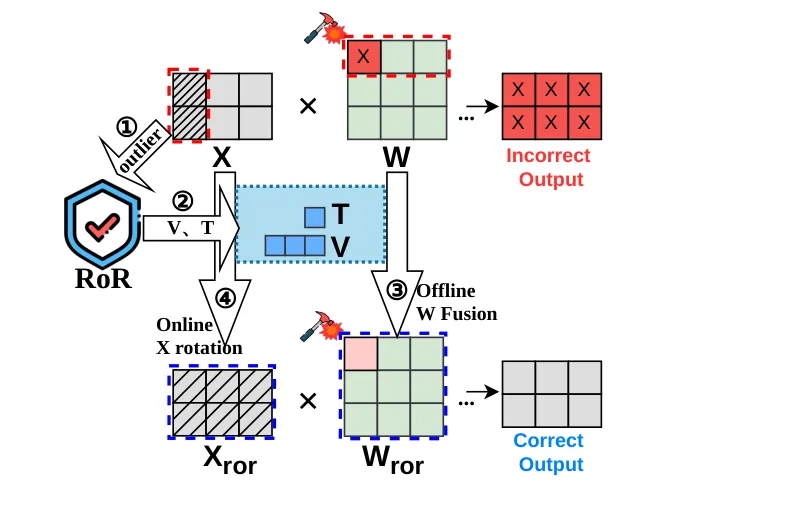 ●RoR 发现了LLM在比特翻转攻击下极度脆弱的根本机制:Transformer 中特定特征通道存在高达均值20倍的极端激活异常值(outliers),一旦与这些异常值交互的权重发生比特翻转,误差就被极度放大,导致 AttentionBreaker 仅用3次比特翻转就能将 LLaMA3-8B 的 MMLU 准确率从67.3%归零。RoR 通过 Householder 正交旋转将异常值平滑分散到所有维度,从根本上切断了这一放大机制。