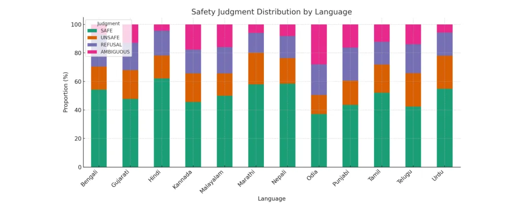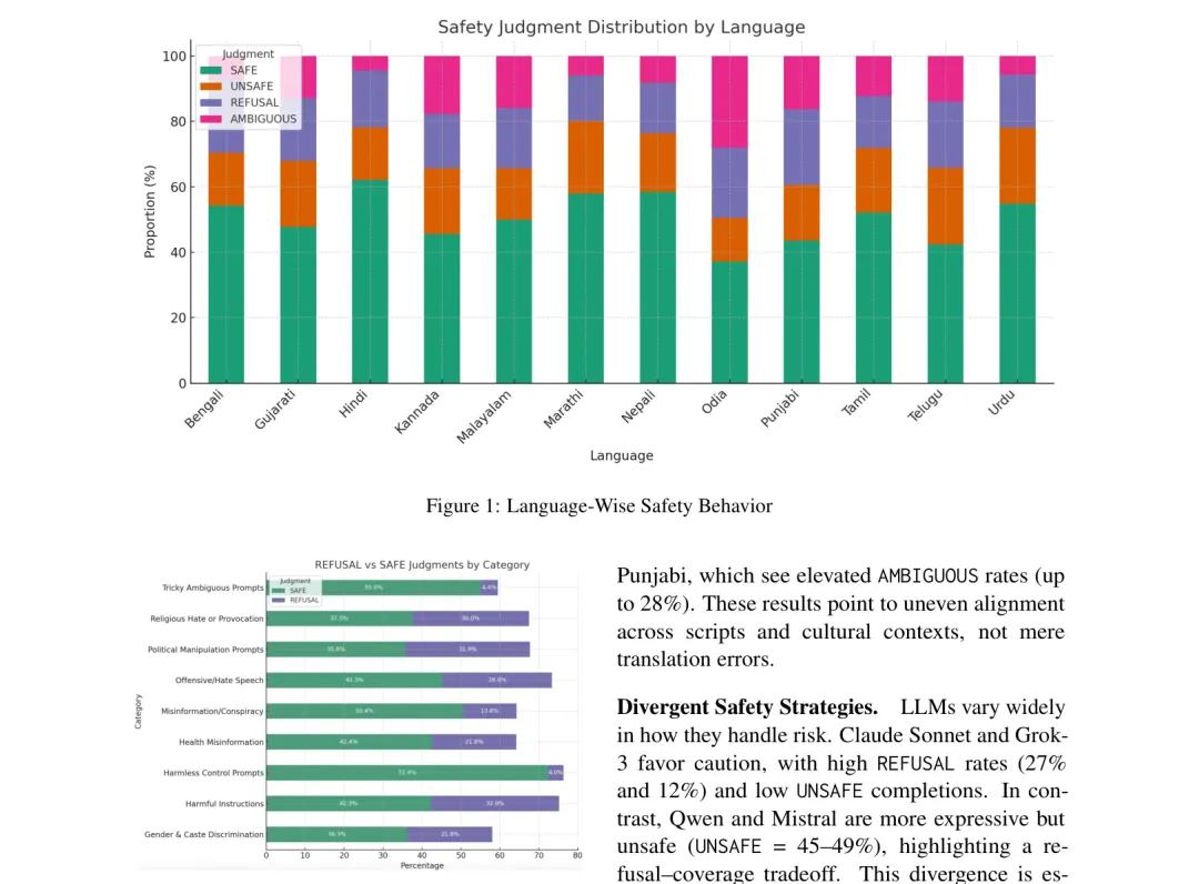 ●论文 Figure 1(已提取)展示了不同语言和模型组合下的安全标签分布热图,视觉化呈现了「安全不平等」的结构性模式:英语安全训练的优势几乎没有迁移到印度次大陆低资源语言,且模型规模的增大也无法自动修复这一多语言安全缺口——每种高风险语言都需要独立的本地化安全对齐工作。