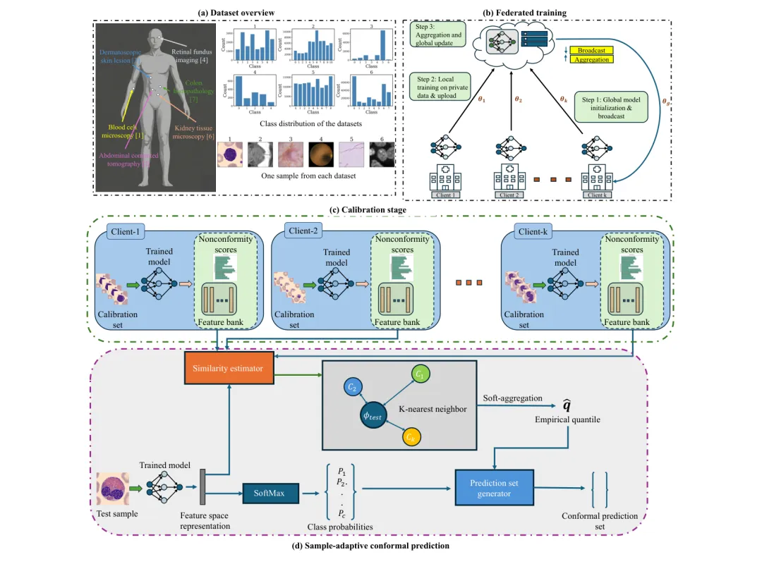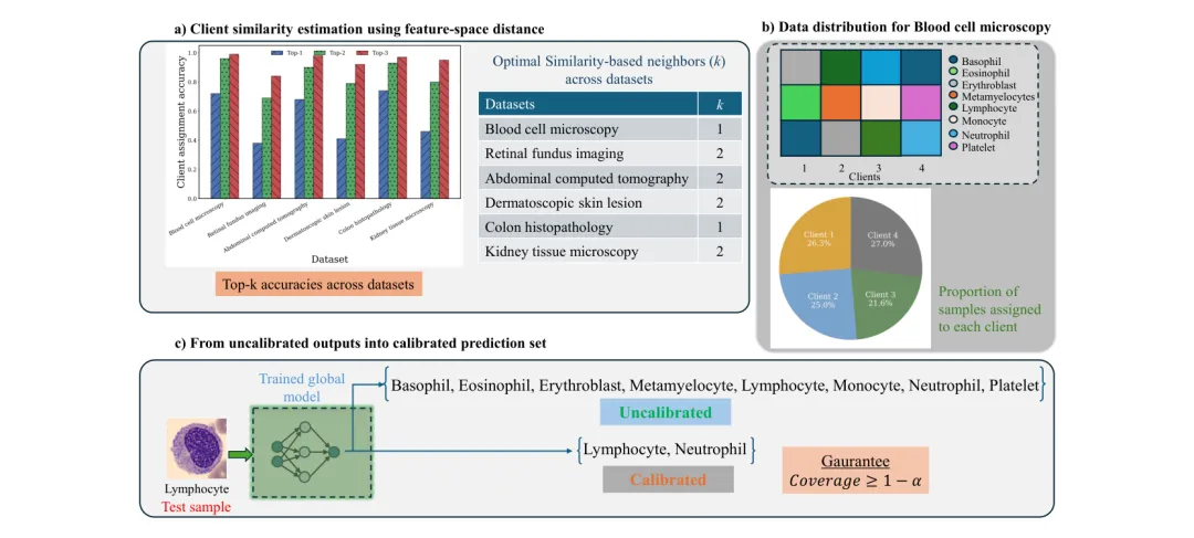 ●在覆盖六种临床影像模态的43万+医学图像上的大规模验证表明,TrustFed 在严格联邦隐私约束下(无中心化数据)实现了跨不同类别数量和不均衡程度数据集的稳健覆盖保证,提供的预测集大小(efficiency)优于现有联邦共形预测基线——实现了隐私、准确性、校准性的三方协同优化。