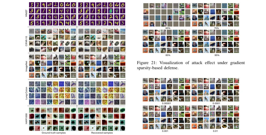 ●研究的关键洞察是:中间层激活(intermediate activations)而非仅仅梯度才是联邦学习中被严重低估的隐私泄露源——论文 Figures 12 和 16(已提取)展示了 ARES 在真实数据集上的重建结果,直观证明了联邦学习「只分享梯度=保护隐私」的基本假设在面对主动攻击者时的脆弱性。