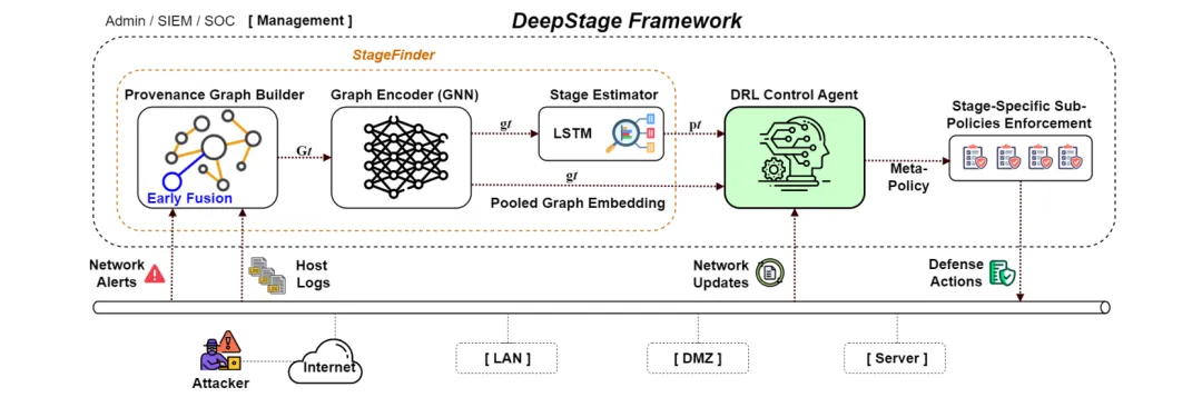 ●DeepStage 将企业网络 APT 防御建模为部分可观测马尔可夫决策过程(POMDP),融合主机来源图和网络遥测数据,通过 GNN 编码器+LSTM 阶段估计器推断攻击者在 MITRE ATT&CK 框架中的当前阶段,再由分层 PPO 智能体选择监控、访问控制、隔离、修复等分阶段防御动作。