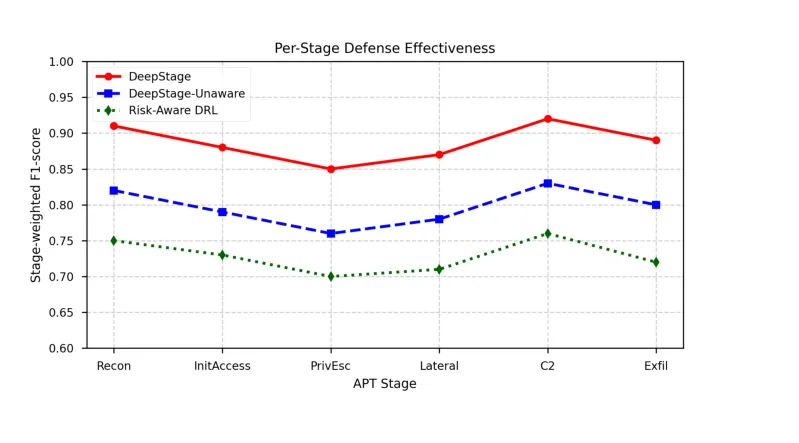 ●在基于 CALDERA 的真实企业环境测试床中,DeepStage 以0.89的阶段加权F1分数超越风险感知DRL基线21.9%,展现了对未见过的攻击链变种的强泛化能力——这一性能来源于阶段感知防御的精准性:在早期侦察阶段采取低代价监控措施,在横向移动阶段才升级到高代价隔离行动。