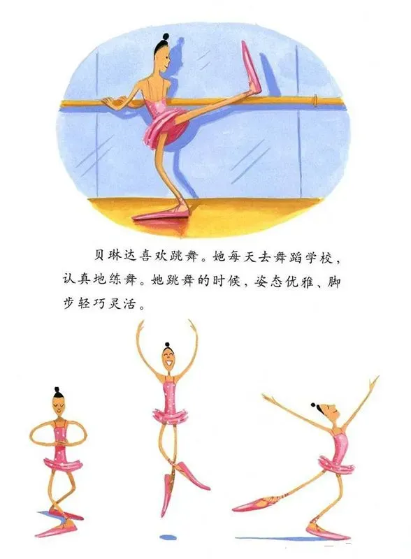 贝琳达喜欢跳舞,她每天去舞蹈学校,认真的练舞。她跳舞的时候,姿态优雅、脚步轻巧灵活。