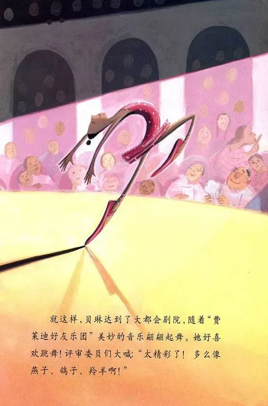 就这样,贝琳达到了大都会剧院,随着“费莱迪好友乐团”美妙的音乐翩翩起舞,她好喜欢跳舞!评审委员们大喊:“太精彩了!多么像燕子、鸽子、羚羊啊!”