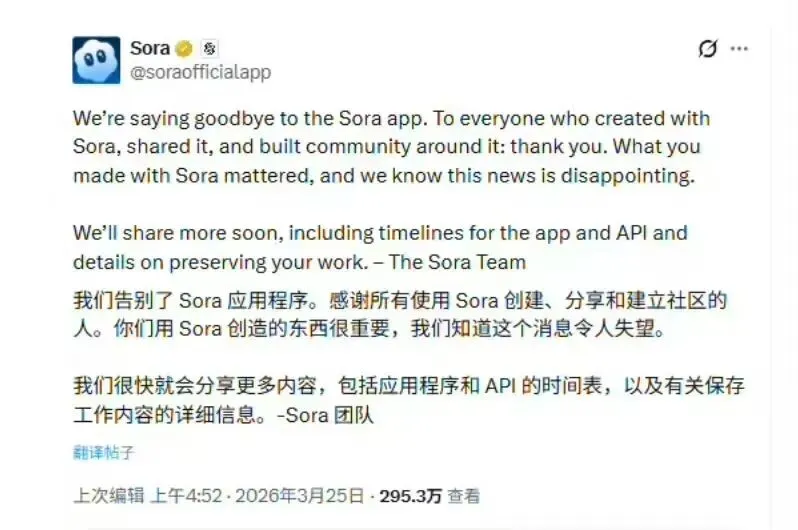 结果呢?才半年时间,OpenAI就官宣:Sora的独立APP、API,还有ChatGPT里的视频功能,全部下线,彻底停服。