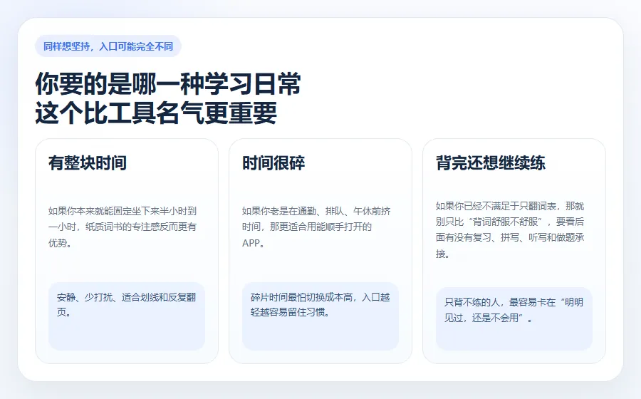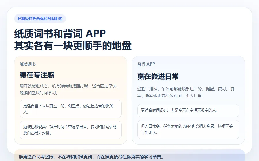 纸质词书适合把人按在一个安静的桌面上。 APP 适合把背词塞回真实生活里。