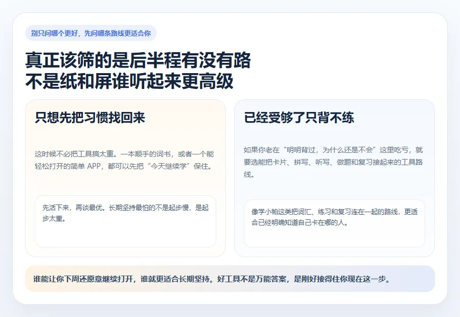这也是我留下学小帕这类工具的原因。它对我有用,不是因为它把背词说得多玄,而是它没让学习停在词表上。前面可以先卡片过一遍,后面再用填写、听写把模糊词揪出来,再往后还有一词一题和复习去接。对那种已经吃过“背了很多还是不会用”这个亏的人,这种路线会更稳。