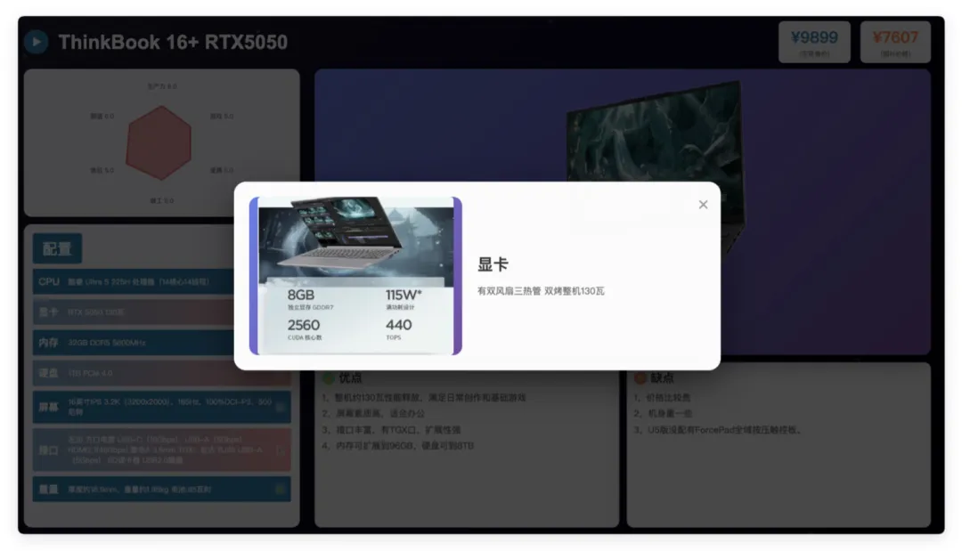 下面这种表格,估计关注笔记本电脑类视频盘点的会比较熟悉。一些参数方面,点击左侧可以弹出中间这个弹窗。