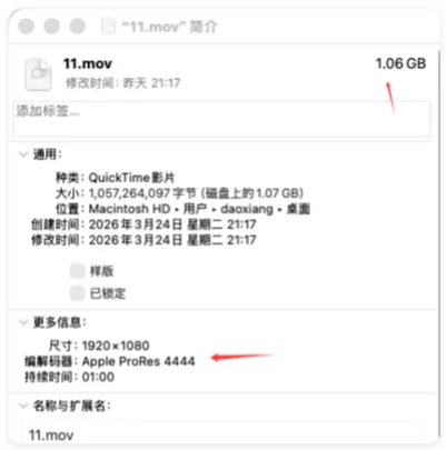 同样内容,要是用Apple ProRes 4444导出的话,体积来到1.06GB的容量,HEVC编码不到只有9.3MB而已,还解决了问题。